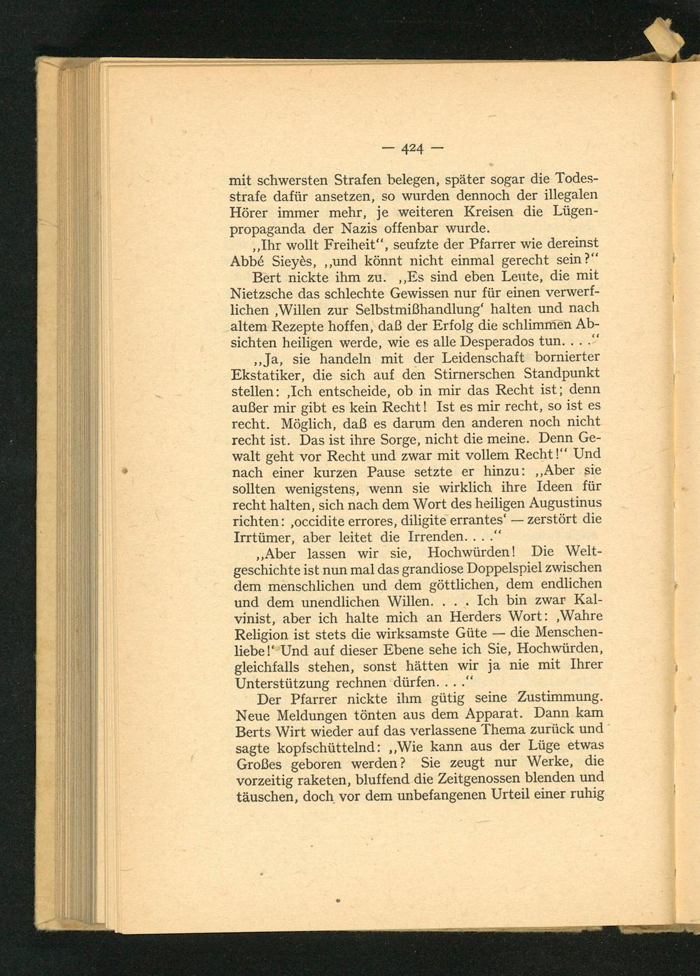 , Ihr wollt Freiheit", seufzte der Pfarrer wie dereinst Abbé Sieyès ,,, und könnt nicht einmal gerecht sein?" Bert nickte ihm zu. ,, Es sind eben Leute, die mit Nietzsche das schlechte Gewissen nur für einen verwerflichen, Willen zur Selbstmiẞhandlung' halten und nach altem Rezepte hoffen, daß der Erfolg die schlimmen Absichten heiligen werde, wie es alle Desperados tun...."