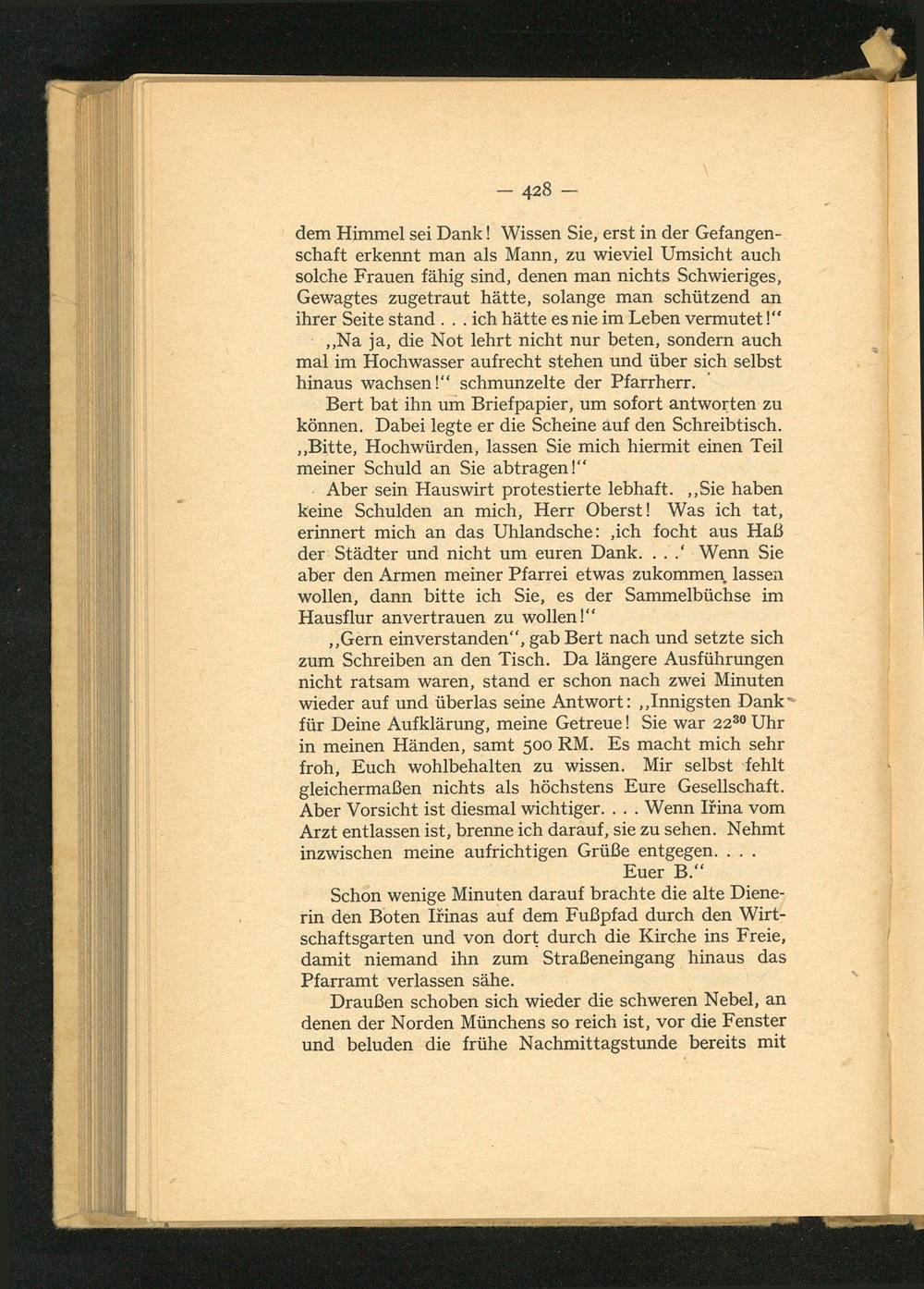 Aber sein Hauswirt protestierte lebhaft. ,, Sie haben keine Schulden an mich, Herr Oberst! Was ich tat, erinnert mich an das Uhlandsche:, ich focht aus Haẞ der Städter und nicht um euren Dank.... Wenn Sie aber den Armen meiner Pfarrei etwas zukommen lassen wollen, dann bitte ich Sie, es der Sammelbüchse im Hausflur anvertrauen zu wollen!"
