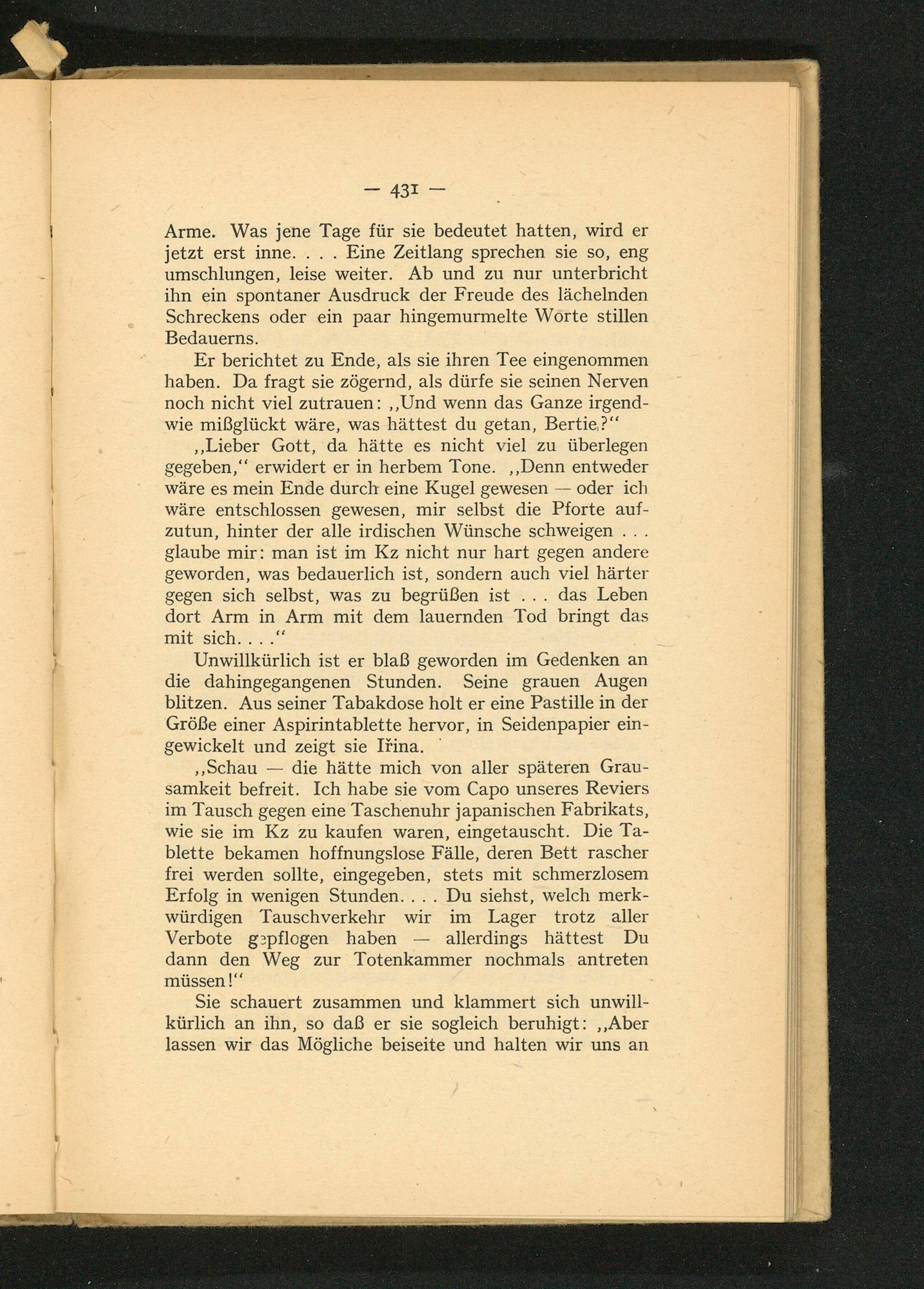 ,, Lieber Gott, da hätte es nicht viel zu überlegen gegeben," erwidert er in herbem Tone. ,, Denn entweder wäre es mein Ende durch eine Kugel gewesen oder ich wäre entschlossen gewesen, mir selbst die Pforte aufzutun, hinter der alle irdischen Wünsche schweigen... glaube mir: man ist im Kz nicht nur hart gegen andere geworden, was bedauerlich ist, sondern auch viel härter gegen sich selbst, was zu begrüßen ist... das Leben dort Arm in Arm mit dem lauernden Tod bringt das mit sich...."