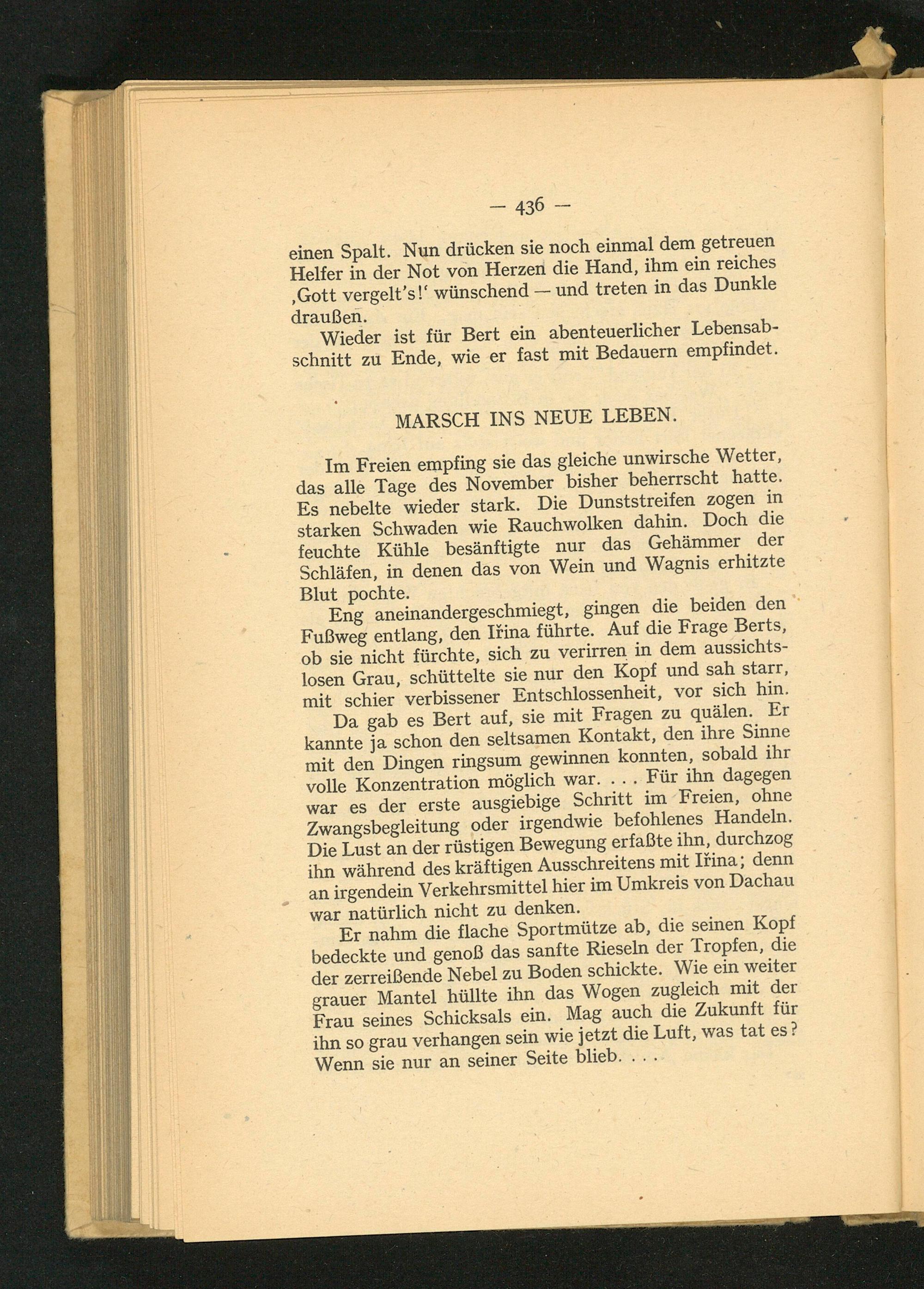 einen Spalt. Nun drücken sie noch einmal dem getreuen Helfer in der Not von Herzen die Hand, ihm ein reiches ‚Gott vergelt’s!‘ wünschend— und treten in das Dunkle draußen.