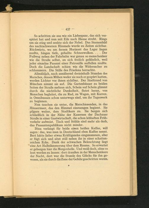 Iřina verlangt für beide einen heißen Kaffee, will sagen: das, was man in Deutschland eben Kaffee nennt. Bert hätte lieber etwas Kräftigendes eingenommen, aber er fügt sich und sitzt still neben ihr in einer schattenreichen Ecke. Dank der schwachen Beleuchtung liegt eine Art Halbdämmerung über dem Raume. So erwartet er geborgen hier die Morgenhelle. Und weiß doch, ohne es laut werden zu lassen: dort draußen in der Menschenleere der Nacht, dort war die Stunde des Glücks für ihn gewesen, als sie durch die Zone der Gefahr geschritten waren.