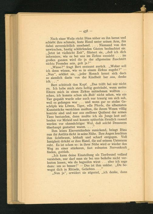 „Ich kann deine Einstellung als Tierfreund vollauf verstehen, nur darf man sie bei uns beileibe nicht ver- lauten lassen, wie du begreifen wirst... aber ich sage dazu: um so besser!‘— Das ist ihm unklar.„Du be- wegst dich in Rätseln, Geliebtes.....“