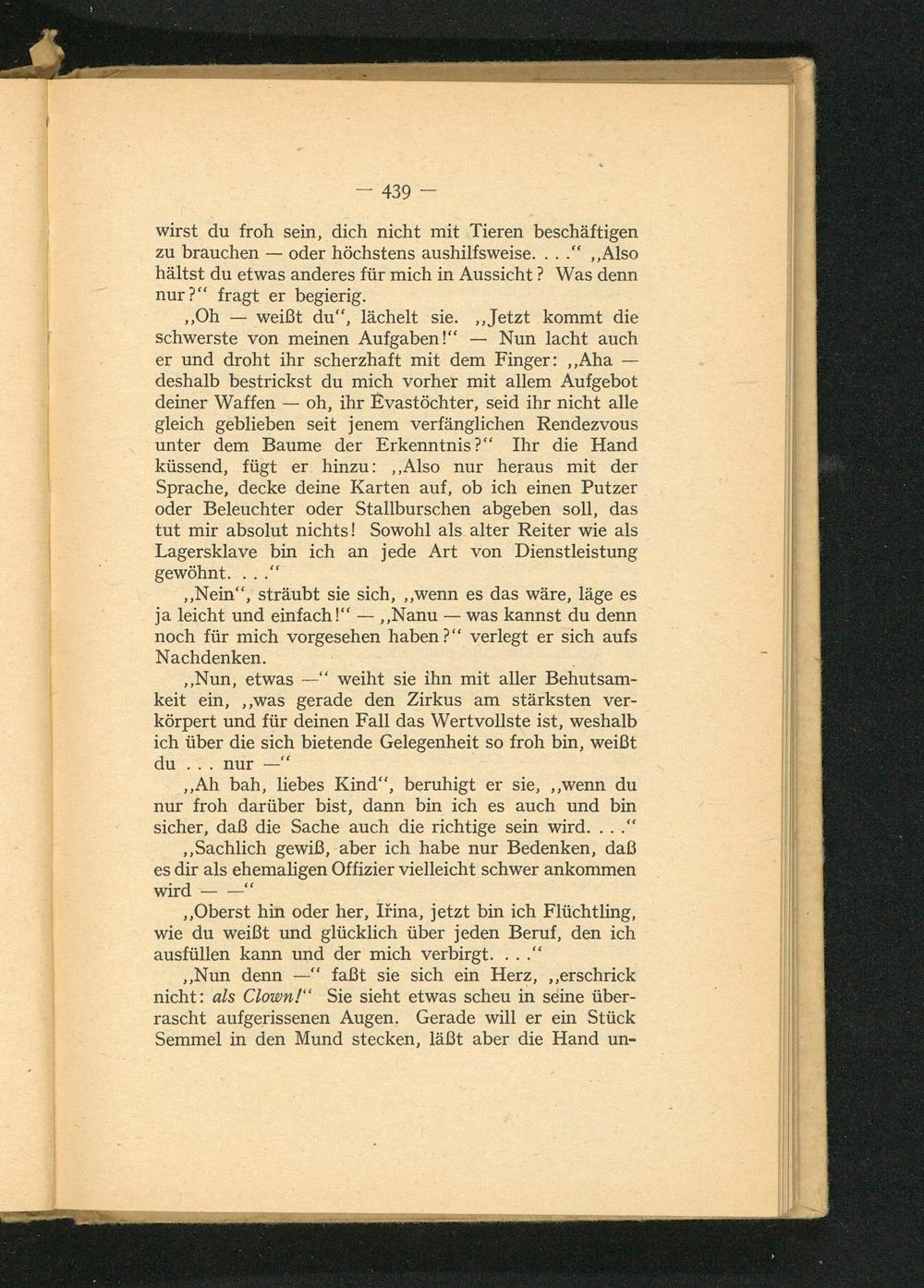 ,, Oh weißt du", lächelt sie. ,, Jetzt kommt die schwerste von meinen Aufgaben!" Nun lacht auch er und droht ihr scherzhaft mit dem Finger: ,, Aha deshalb bestrickst du mich vorher mit allem Aufgebot deiner Waffen- oh, ihr Evastöchter, seid ihr nicht alle gleich geblieben seit jenem verfänglichen Rendezvous unter dem Baume der Erkenntnis?" Ihr die Hand küssend, fügt er hinzu: ,, Also nur heraus mit der Sprache, decke deine Karten auf, ob ich einen Putzer oder Beleuchter oder Stallburschen abgeben soll, das tut mir absolut nichts! Sowohl als alter Reiter wie als Lagersklave bin ich an jede Art von Dienstleistung gewöhnt....