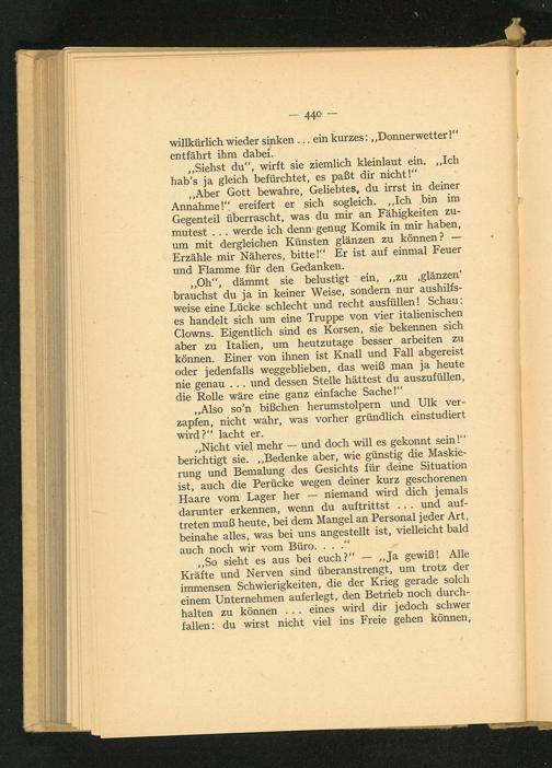 ,, Nicht viel mehr- und doch will es gekonnt sein!" berichtigt sie. ,, Bedenke aber, wie günstig die Maskierung und Bemalung des Gesichts für deine Situation ist, auch die Perücke wegen deiner kurz geschorenen Haare vom Lager her niemand wird dich jemals darunter erkennen, wenn du auftrittst... und auftreten muß heute, bei dem Mangel an Personal jeder Art, beinahe alles, was bei uns angestellt ist, vielleicht bald auch noch wir vom Büro...."