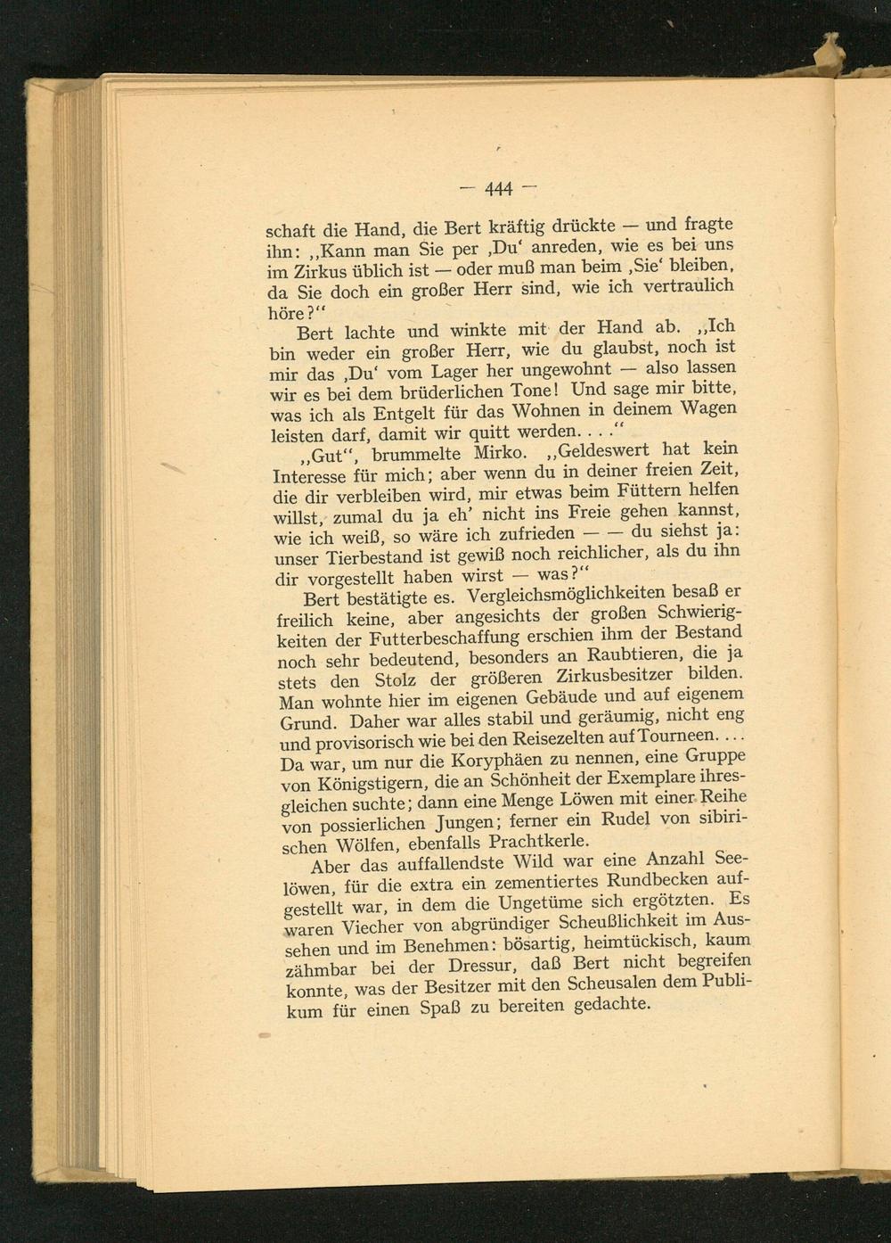 schaft die Hand, die Bert kräftig drückte und fragte ihn: ,, Kann man Sie per, Du' anreden, wie es bei uns im Zirkus üblich ist oder muß man beim, Sie' bleiben, da Sie doch ein großer Herr sind, wie ich vertraulich höre?"