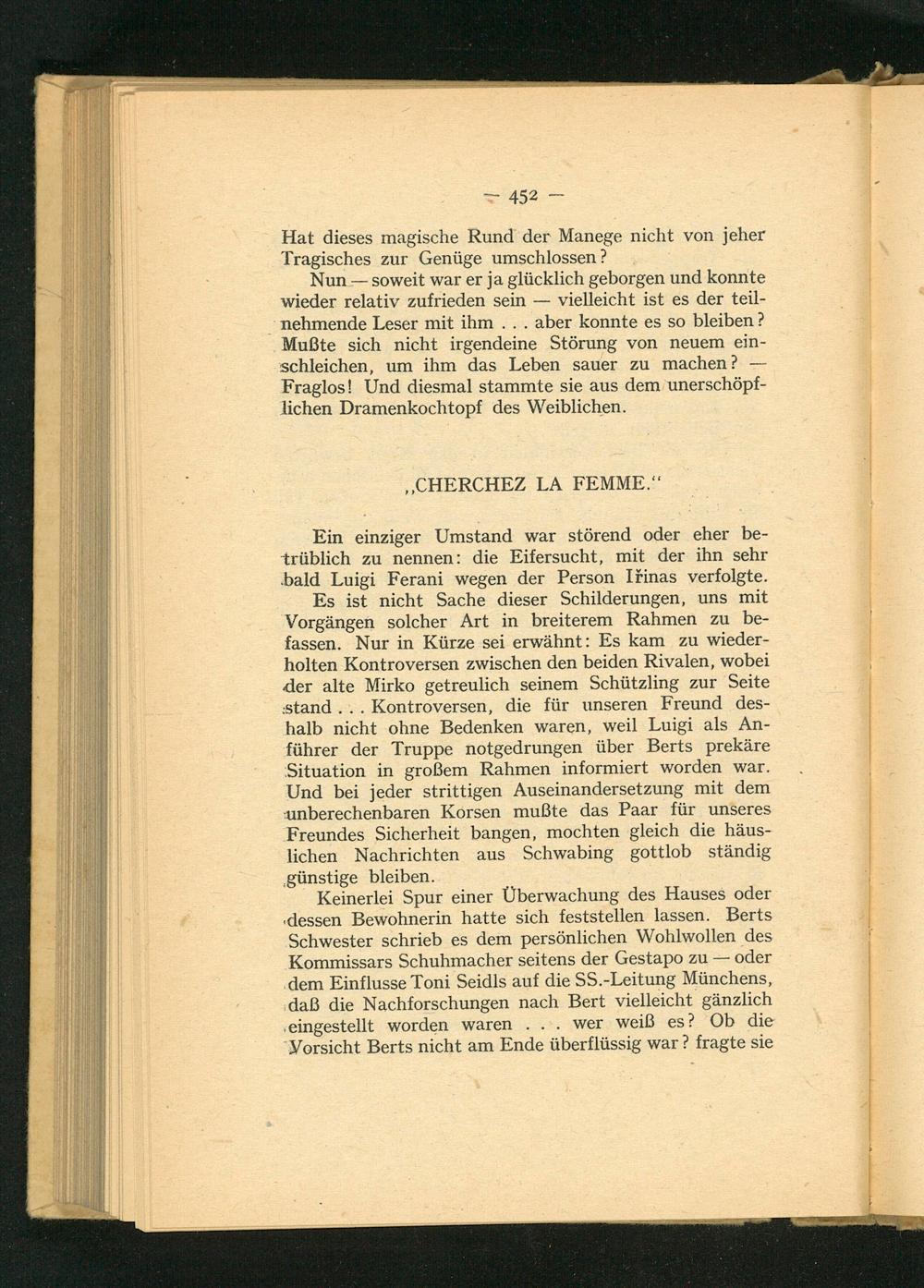 Keinerlei Spur einer Überwachung des Hauses oder dessen Bewohnerin hatte sich feststellen lassen. Berts Schwester schrieb es dem persönlichen Wohlwollen des Kommissars Schuhmacher seitens der Gestapo zu- oder dem Einflusse Toni Seidls auf die SS.- Leitung Münchens , daß die Nachforschungen nach Bert vielleicht gänzlich eingestellt worden waren wer weiß es? Ob die Vorsicht Berts nicht am Ende überflüssig war? fragte sie