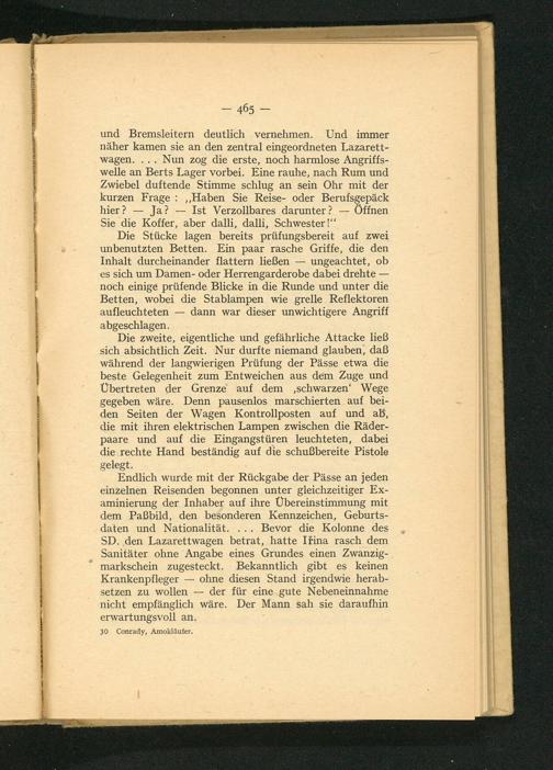 Die zweite, eigentliche und gefährliche Attacke ließ sich absichtlich Zeit. Nur durfte niemand glauben, daß während der langwierigen Prüfung der Pässe etwa die beste Gelegenheit zum Entweichen aus dem Zuge und Übertreten der Grenze auf dem ‚schwarzen‘ Wege gegeben wäre. Denn pausenlos marschierten auf bei- den Seiten der Wagen Kontrollposten auf und ab, die mit ihren elektrischen Lampen zwischen die Räder- paare und auf die Eingangstüren leuchteten, dabei die rechte Hand beständig auf die schußbereite Pistole gelegt.