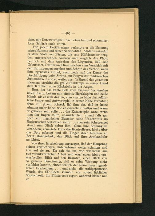 Bert, der das letzte Bett vom Eingang her gesehen belegt hatte, bekam nun effektiv Herzklopfen und heiße Hände, als er zum dritten, zum vierten Male das gefähr- liche Frage- und Antwortspiel in seiner Nähe vernahm; denn mit jähem Schreck fiel ihm ein, daß er keine Ahnung mehr habe, wie er eigentlich heißen und wann er geboren sein solle... die Katastrophe wäre, wenn man ihn fragen sollte, unausbleiblich, zumal falls gar noch ein ungarischer Beamter seine Unkenntnis im Madyarischen feststellen sollte... aber sein Schutzengel stand zum Glück neben ihm. Ohne ihre Stellung zu verändern, erwartete Ifina die Kontrolleure, leicht über das Bett gebeugt und die Finger ihrer Rechten an Berts Handgelenk, den Blick auf ihre Armbanduhr gerichtet.