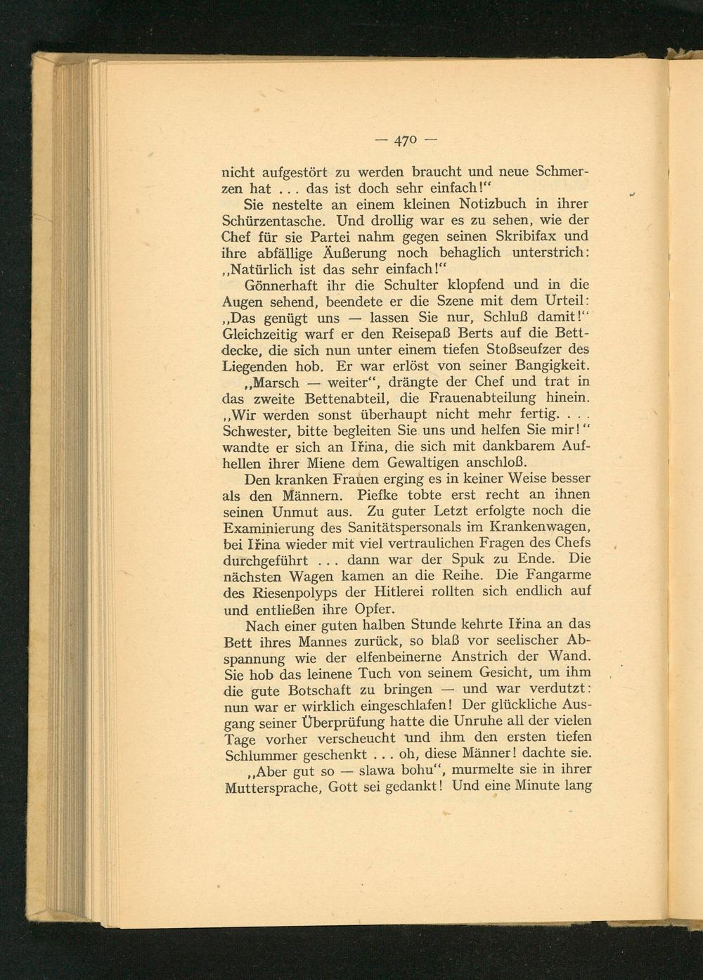 Den kranken Fratien erging es in keiner Weise besser als den Männern. Piefke tobte erst recht an ihnen seinen Unmut aus. Zu guter Letzt erfolgte noch die Examinierung des Sanitätspersonals im Krankenwagen, bei Ifina wieder mit viel vertraulichen Fragen des Chefs durchgeführt... dann war der Spuk zu Ende. Die nächsten Wagen kamen an die Reihe. Die Fangarme des Riesenpolyps der Hitlerei rollten sich endlich auf und entließen ihre Opfer.