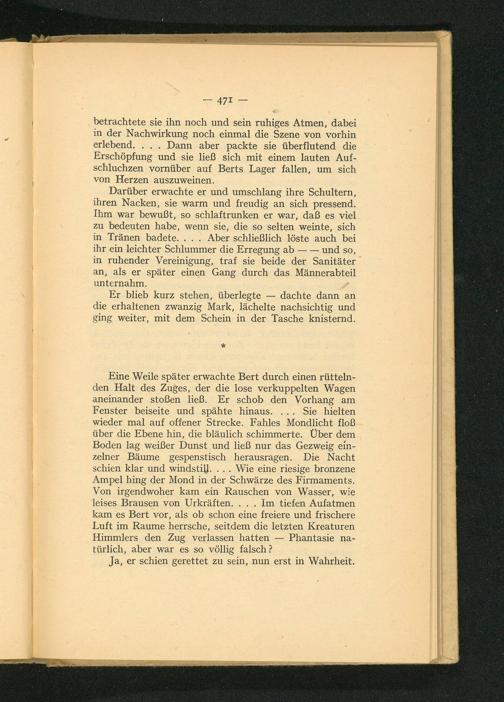 Darüber erwachte er und umschlang ihre Schultern, ihren Nacken, sie warm und freudig an sich pressend. Ihm war bewußt, so schlaftrunken er war, daß es viel zu bedeuten habe, wenn sie, die so selten weinte, sich in Tränen badete.... Aber schließlich löste auch bei ihr ein leichter Schlummer die Erregung ab-- und so, in ruhender Vereinigung, traf sie beide der Sanitäter an, als er später einen Gang durch das Männerabteil unternahm.