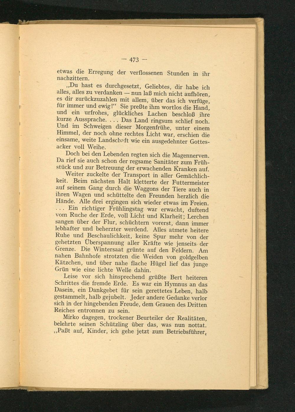 ,, Du hast es durchgesetzt, Geliebtes, dir habe ich alles, alles zu verdanken nun laẞ mich nicht aufhören, es dir zurückzuzahlen mit allem, über das ich verfüge, für immer und ewig!" Sie preßte ihm wortlos die Hand, und ein urfrohes, glückliches Lachen beschloß ihre kurze Aussprache.... Das Land ringsum schlief noch. Und im Schweigen dieser Morgenfrühe, unter einem Himmel, der noch ohne rechtes Licht war, erschien die einsame, weite Landschaft wie ein ausgedehnter Gottesacker voll Weihe.