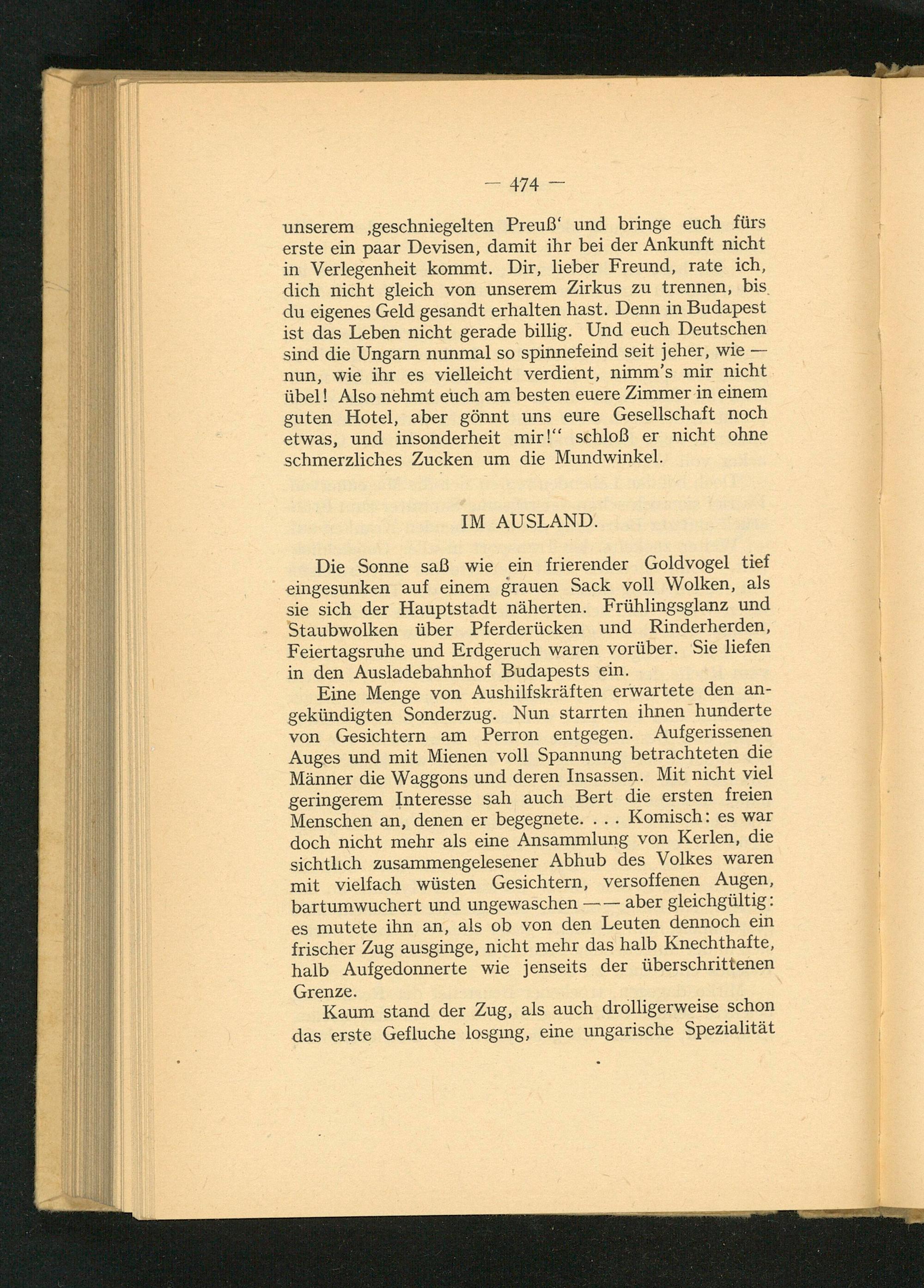 unserem, geschniegelten Preuß und bringe euch fürs erste ein paar Devisen, damit ihr bei der Ankunft nicht in Verlegenheit kommt. Dir, lieber Freund, rate ich, dich nicht gleich von unserem Zirkus zu trennen, bis du eigenes Geld gesandt erhalten hast. Denn in Budapest ist das Leben nicht gerade billig. Und euch Deutschen sind die Ungarn nunmal so spinnefeind seit jeher, wie- nun, wie ihr es vielleicht verdient, nimm's mir nicht übel! Also nehmt euch am besten euere Zimmer in einem guten Hotel, aber gönnt uns eure Gesellschaft noch etwas, und insonderheit mir!" schloß er nicht ohne schmerzliches Zucken um die Mundwinkel.