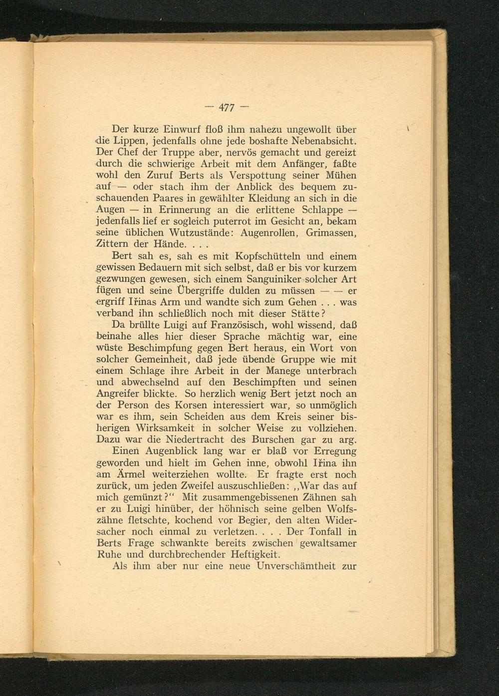 Da brüllte Luigi auf Französisch, wohl wissend, daß beinahe alles hier dieser Sprache mächtig war, eine wüste Beschimpfung gegen Bert heraus, ein Wort von solcher Gemeinheit, daß jede übende Gruppe wie mit einem Schlage ihre Arbeit in der Manege unterbrach und abwechselnd auf den Beschimpften und seinen Angreifer blickte. So herzlich wenig Bert jetzt noch an der Person des Korsen interessiert war, so unmöglich war es ihm, sein Scheiden aus dem Kreis seiner bis- herigen Wirksamkeit in solcher Weise zu vollziehen. Dazu war die Niedertracht des Burschen gar zu arg.