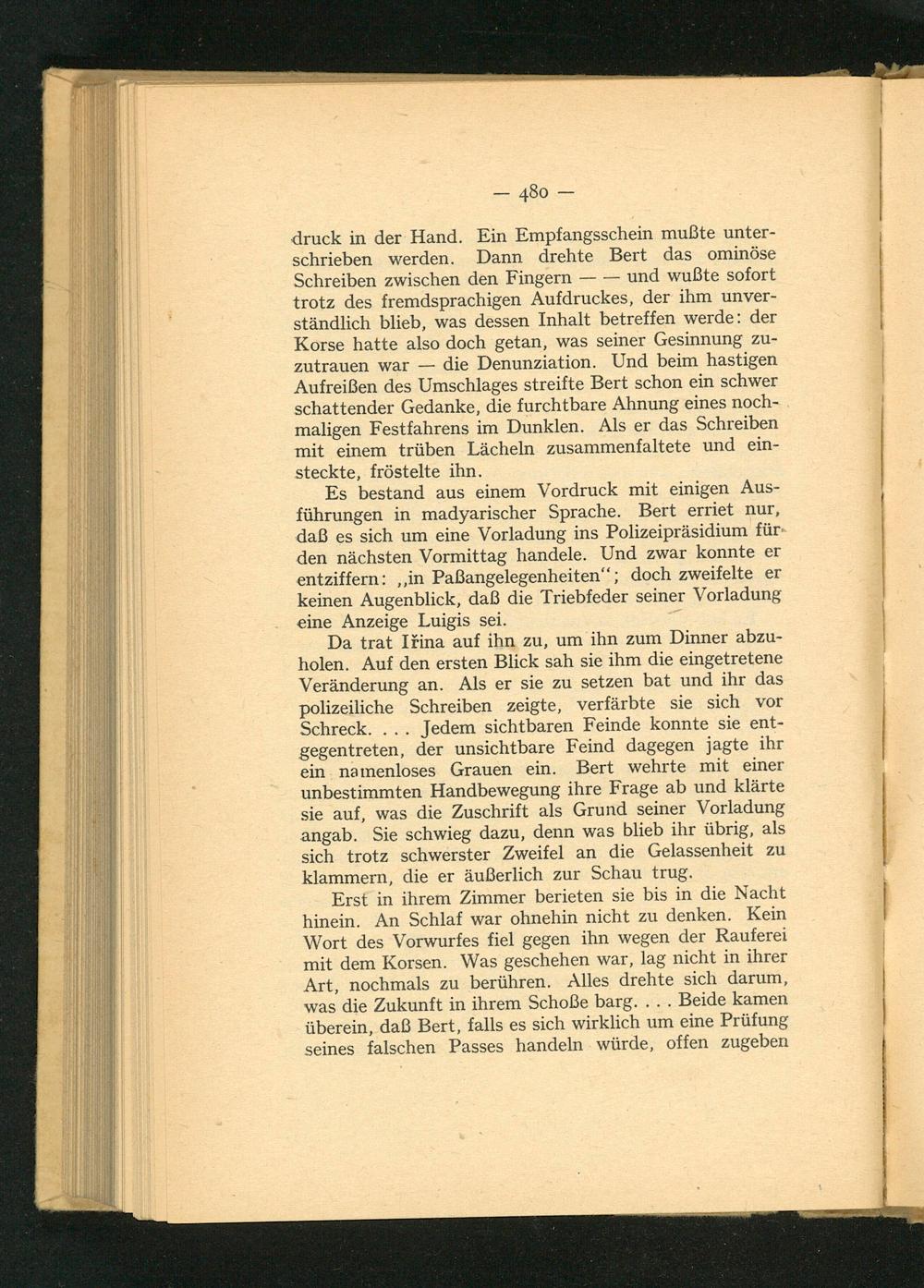 Es bestand aus einem Vordruck mit einigen Aus- führungen in madyarischer Sprache. Bert erriet nur, daß es sich um eine Vorladung ins Polizeipräsidium für: den nächsten Vormittag handele. Und zwar konnte er entziffern:„in Paßangelegenheiten“; doch zweifelte er keinen Augenblick, daß die Triebfeder seiner Vorladung eine Anzeige Luigis sei.