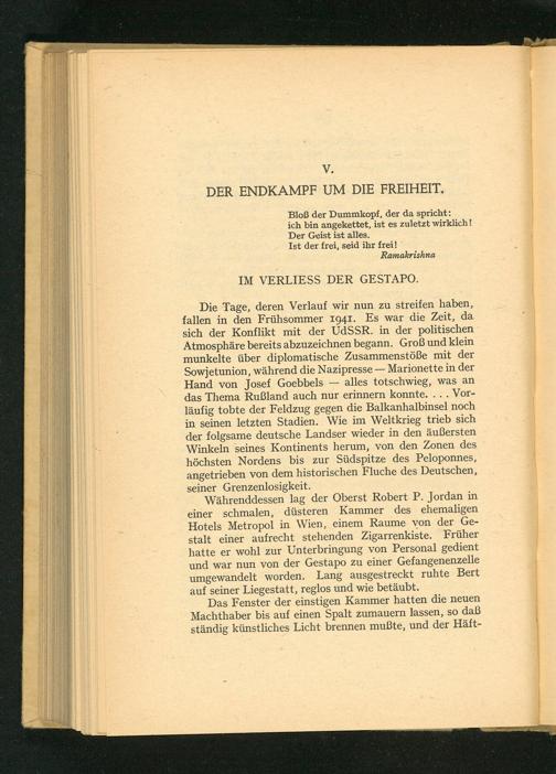 Währenddessen lag der Oberst Robert P. Jordan in einer schmalen, düsteren Kammer des ehemaligen Hotels Metropol in Wien , einem Raume von der Gestalt einer aufrecht stehenden Zigarrenkiste. Früher hatte er wohl zur Unterbringung von Personal gedient und war nun von der Gestapo zu einer Gefangenenzelle umgewandelt worden. Lang ausgestreckt ruhte Bert auf seiner Liegestatt, reglos und wie betäubt.