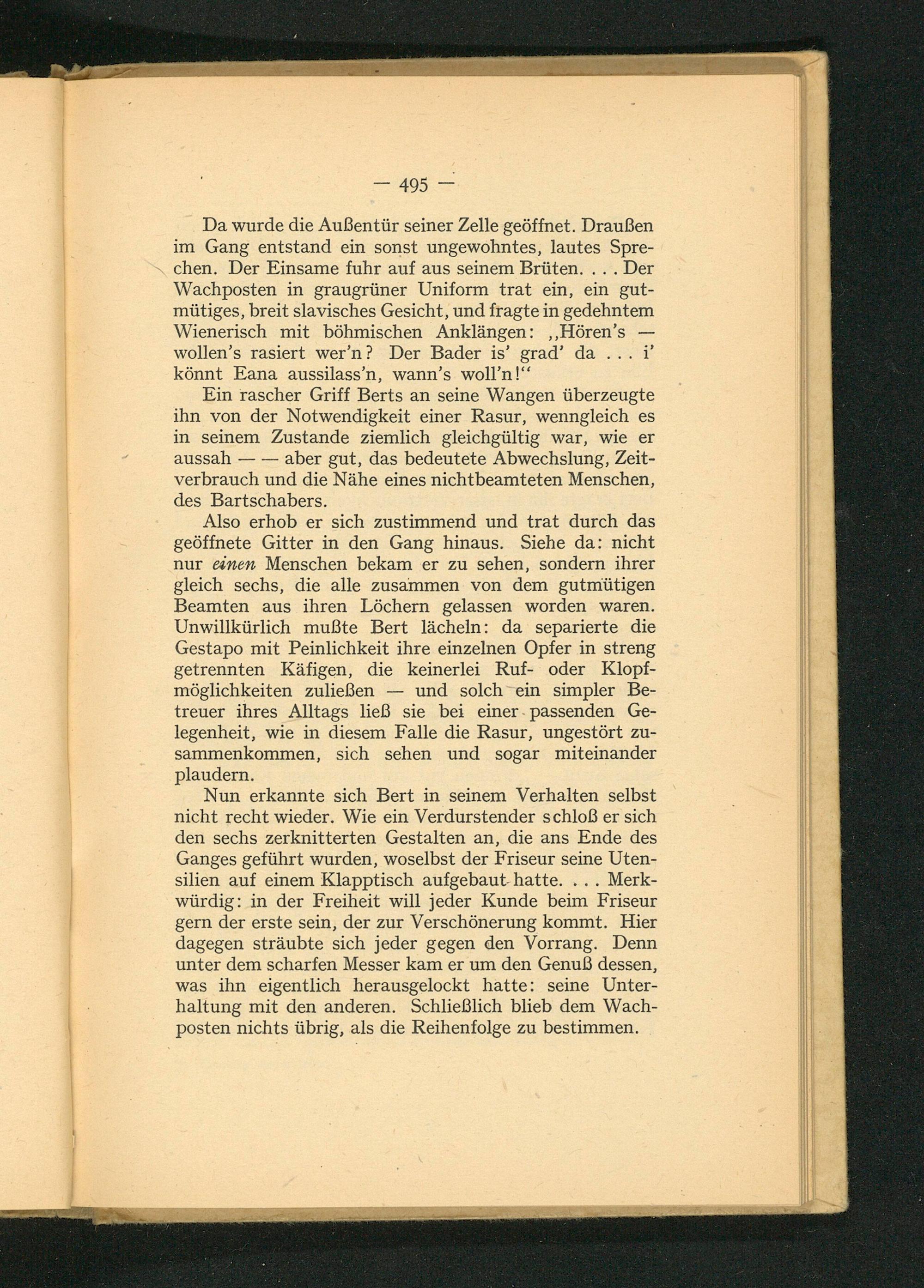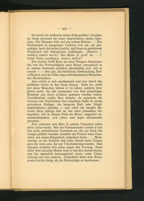 Da wurde die Außentür seiner Zelle geöffnet. Draußen im Gang entstand ein sonst ungewohntes, lautes Sprechen. Der Einsame fuhr auf aus seinem Brüten.... Der Wachposten in graugrüner Uniform trat ein, ein gutmütiges, breit slavisches Gesicht, und fragte in gedehntem Wienerisch mit böhmischen Anklängen: ,, Hören's wollen's rasiert wer'n? Der Bader is' grad' da... i' könnt Eana aussilass'n, wann's woll'n!"
