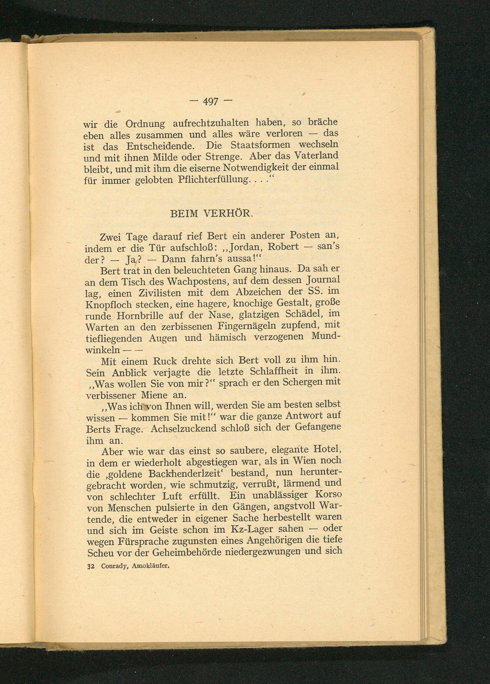Zwei Tage darauf rief Bert ein anderer Posten an, indem er die Tür aufschloß: ,, Jordan, Robert- san's der? Ja? Dann fahrn's aussa!"