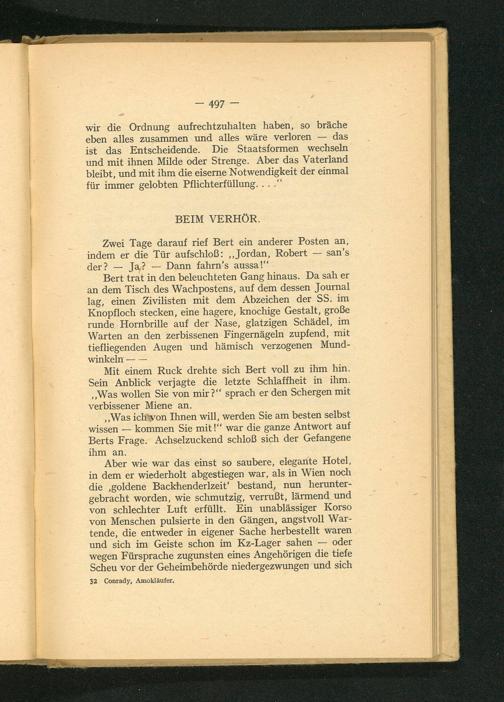 Bert trat in den beleuchteten Gang hinaus. Da sah er an dem Tisch des Wachpostens, auf dem dessen Journal lag, einen Zivilisten mit dem Abzeichen der SS. im Knopfloch stecken, eine hagere, knochige Gestalt, große runde Hornbrille auf der Nase, glatzigen Schädel, im Warten an den zerbissenen Fingernägeln zupfend, mit tiefliegenden Augen und hämisch verzogenen Mundwinkeln-