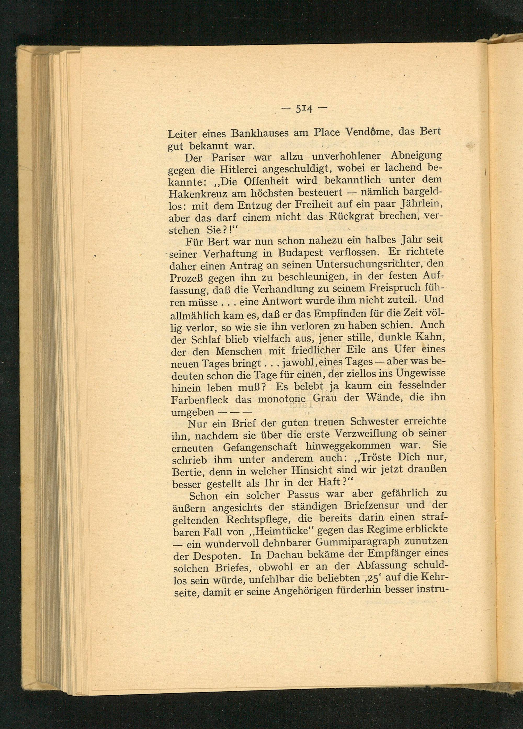 Für Bert war nun schon nahezu ein halbes Jahr seit seiner Verhaftung in Budapest verflossen. Er richtete daher einen Antrag an seinen Untersuchungsrichter, den Prozeß gegen ihn zu beschleunigen, in der festen Auffassung, daß die Verhandlung zu seinem Freispruch führen müsse... eine Antwort wurde ihm nicht zuteil. Und allmählich kam es, daß er das Empfinden für die Zeit völlig verlor, so wie sie ihn verloren zu haben schien. Auch der Schlaf blieb vielfach aus, jener stille, dunkle Kahn, der den Menschen mit friedlicher Eile ans Ufer eines neuen Tages bringt... jawohl, eines Tages- aber was bedeuten schon die Tage für einen, der ziellos ins Ungewisse hinein leben muß? Es belebt ja kaum ein fesselnder Farbenfleck das monotone Grau der Wände, die ihn umgeben