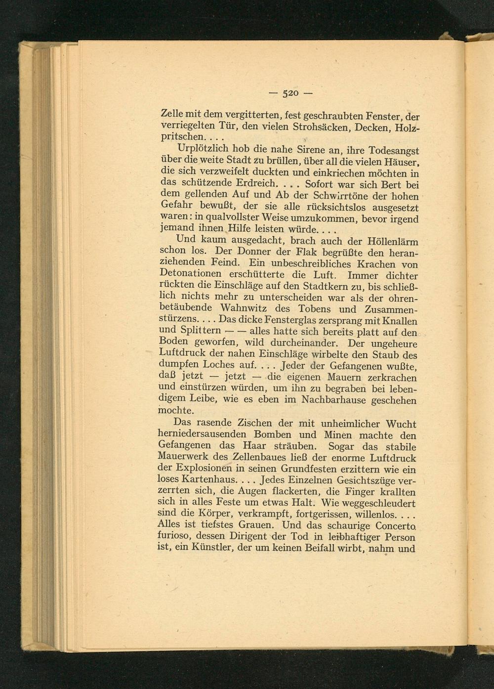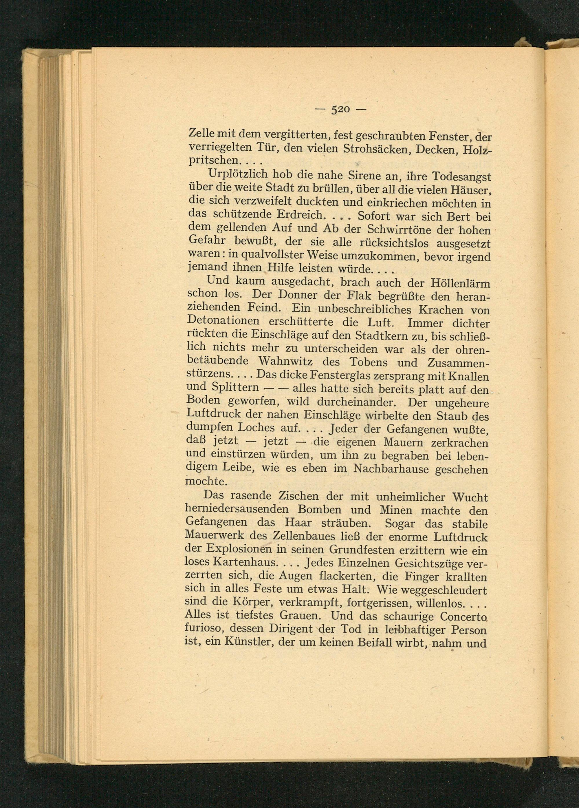 Und kaum ausgedacht, brach auch der Höllenlärm schon los. Der Donner der Flak begrüßte den heranziehenden Feind. Ein unbeschreibliches Krachen von Detonationen erschütterte die Luft. Immer dichter rückten die Einschläge auf den Stadtkern zu, bis schließlich nichts mehr zu unterscheiden war als der ohrenbetäubende Wahnwitz des Tobens und Zusammenstürzens.... Das dicke Fensterglas zersprang mit Knallen und Splittern alles hatte sich bereits platt auf den Boden geworfen, wild durcheinander. Der ungeheure Luftdruck der nahen Einschläge wirbelte den Staub des dumpfen Loches auf.... Jeder der Gefangenen wußte, daẞ jetzt die eigenen Mauern zerkrachen und einstürzen würden, um ihn zu begraben bei lebendigem Leibe, wie es eben im Nachbarhause geschehen mochte.