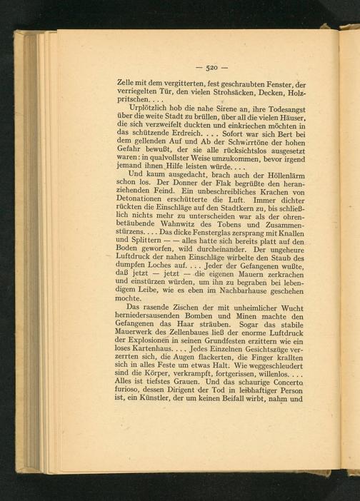 Das rasende Zischen der mit unheimlicher Wucht herniedersausenden Bomben und Minen machte den Gefangenen das Haar sträuben. Sogar das stabile Mauerwerk des Zellenbaues ließ der enorme Luftdruck der Explosionen in seinen Grundfesten erzittern wie ein loses Kartenhaus.... Jedes Einzelnen Gesichtszüge verzerrten sich, die Augen flackerten, die Finger krallten sich in alles Feste um etwas Halt. Wie weggeschleudert sind die Körper, verkrampft, fortgerissen, willenlos.... Alles ist tiefstes Grauen. Und das schaurige Concerto furioso, dessen Dirigent der Tod in leibhaftiger Person ist, ein Künstler, der um keinen Beifall wirbt, nahm und