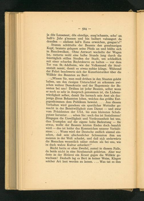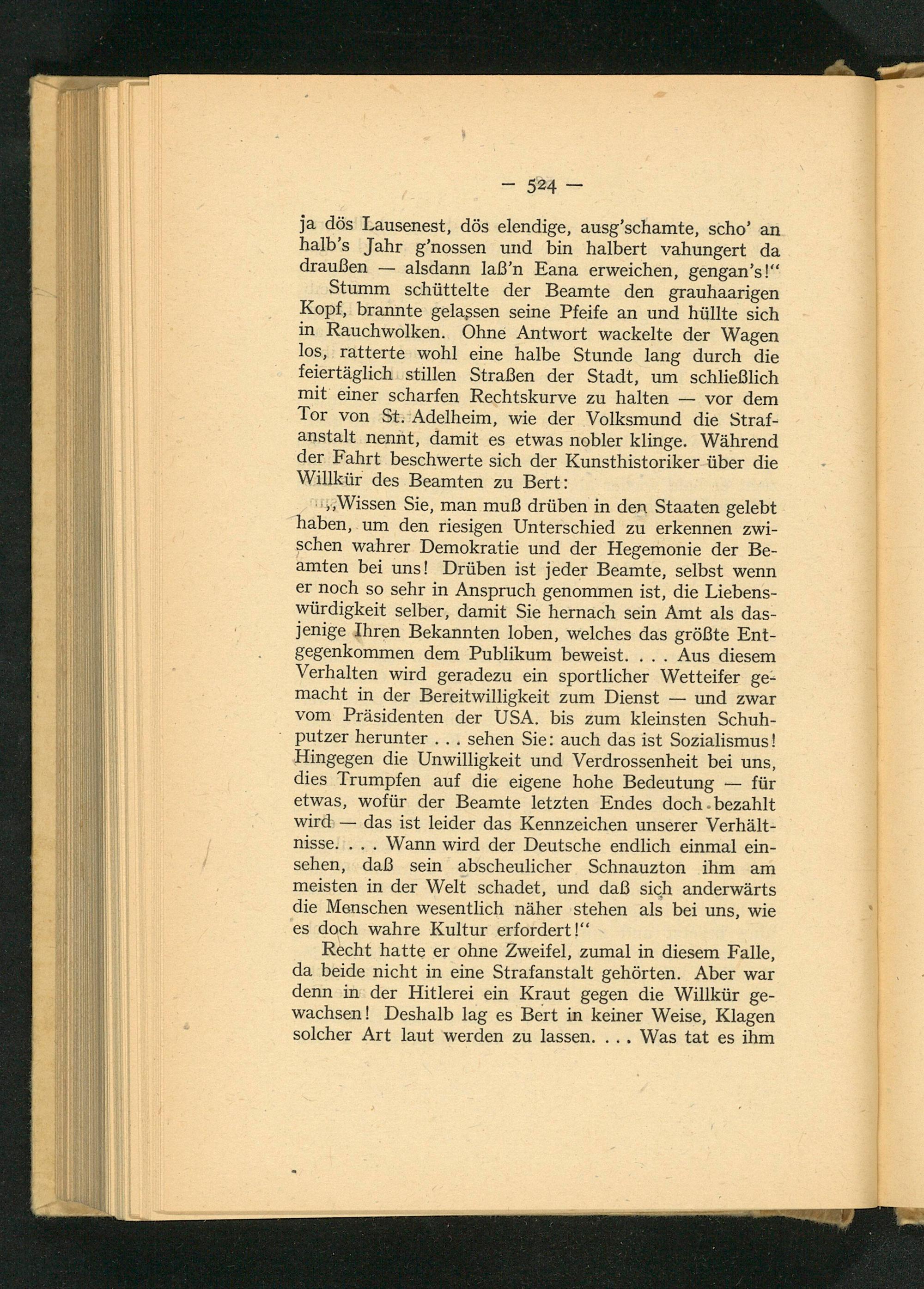 Wissen Sie, man muß drüben in den Staaten gelebt haben, um den riesigen Unterschied zu erkennen zwischen wahrer Demokratie und der Hegemonie der Beamten bei uns! Drüben ist jeder Beamte, selbst wenn er noch so sehr in Anspruch genommen ist, die Liebenswürdigkeit selber, damit Sie hernach sein Amt als dasjenige Ihren Bekannten loben, welches das größte Entgegenkommen dem Publikum beweist.... Aus diesem Verhalten wird geradezu ein sportlicher Wetteifer gemacht in der Bereitwilligkeit zum Dienst und zwar vom Präsidenten der USA . bis zum kleinsten Schuhputzer herunter... sehen Sie: auch das ist Sozialismus! Hingegen die Unwilligkeit und Verdrossenheit bei uns, dies Trumpfen auf die eigene hohe Bedeutung für etwas, wofür der Beamte letzten Endes doch bezahlt wird das ist leider das Kennzeichen unserer Verhältnisse.... Wann wird der Deutsche endlich einmal einsehen, daß sein abscheulicher Schnauzton ihm am meisten in der Welt schadet, und daß sich anderwärts die Menschen wesentlich näher stehen als bei uns, wie es doch wahre Kultur erfordert!"