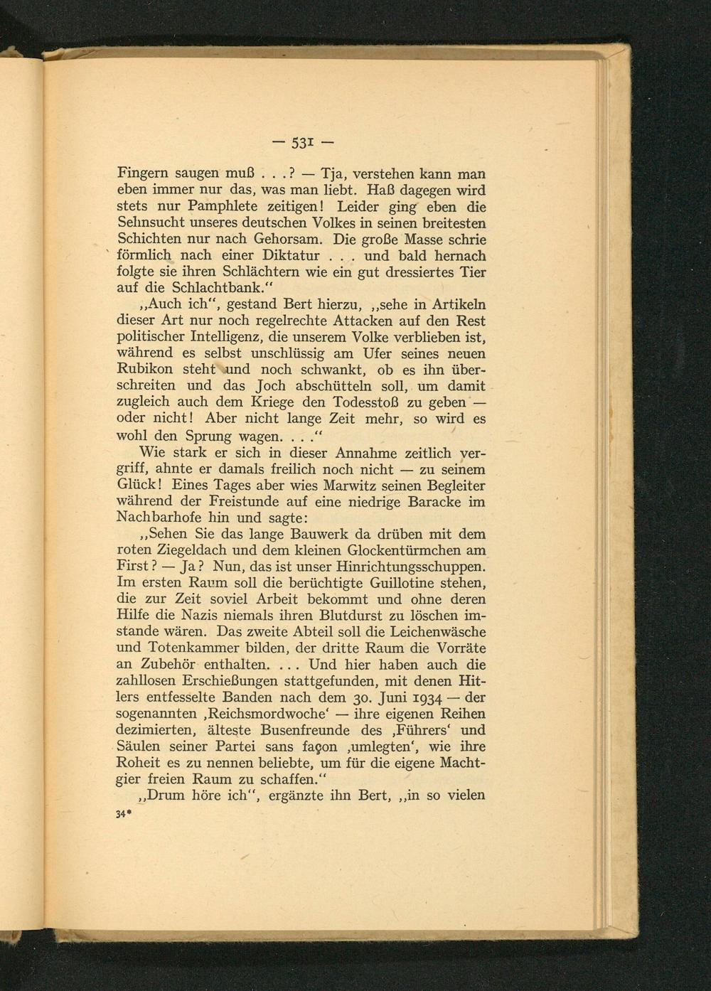 „Sehen Sie das lange Bauwerk da drüben mit dem roten Ziegeldach und dem kleinen Glockentürmchen am First?— Ja? Nun, das ist unser Hinrichtungsschuppen. Im ersten Raum soll die berüchtigte Guillotine stehen, die zur Zeit soviel Arbeit bekommt und ohne deren Hilfe die Nazis niemals ihren Blutdurst zu löschen im- stande wären. Das zweite Abteil soll die Leichenwäsche und Totenkammer bilden, der dritte Raum die Vorräte an Zubehör: enthalten.... Und hier haben auch die zahllosen Erschießungen stattgefunden, mit denen Hit- lers entfesselte Banden nach dem 30. Juni 1934— der sogenannten ‚Reichsmordwoche‘— ihre eigenen Reihen dezimierten, älteste Busenfreunde des ‚Führers‘ und Säulen seiner Partei sans fagon ‚umlegten‘, wie ihre Roheit es zu nennen beliebte, um für die eigene Macht- gier freien Raum zu schaffen.‘