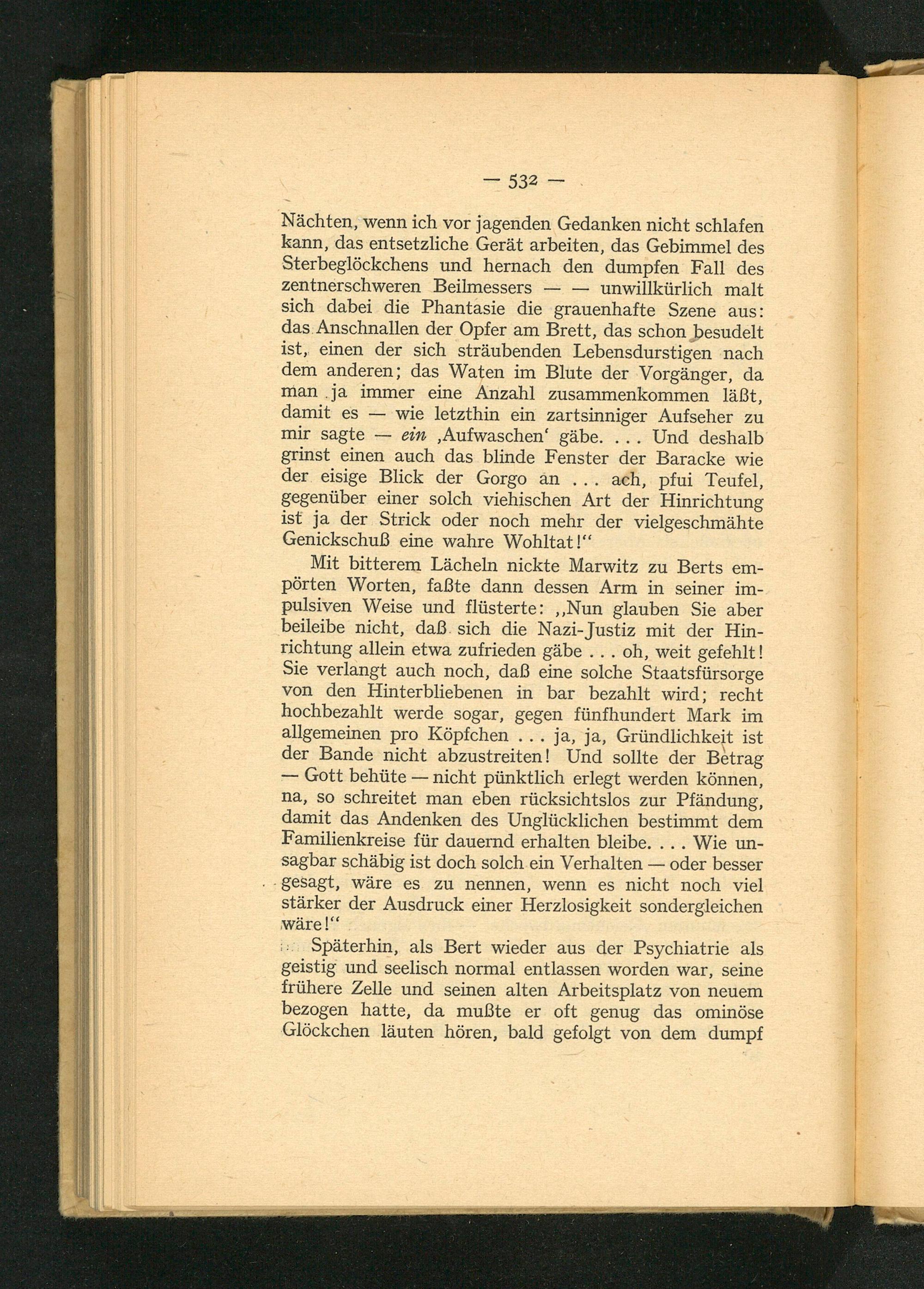 Nächten, wenn ich vor jagenden Gedanken nicht schlafen kann, das entsetzliche Gerät arbeiten, das Gebimmel des Sterbeglöckchens und hernach den dumpfen Fall des zentnerschweren Beilmessers unwillkürlich malt sich dabei die Phantasie die grauenhafte Szene aus: das Anschnallen der Opfer am Brett, das schon besudelt ist, einen der sich sträubenden Lebensdurstigen nach dem anderen; das Waten im Blute der Vorgänger, da man ja immer eine Anzahl zusammenkommen läßt, damit es wie letzthin ein zartsinniger Aufseher zu mir sagte ein, Aufwaschen' gäbe.... Und deshalb grinst einen auch das blinde Fenster der Baracke wie der eisige Blick der Gorgo an ach, pfui Teufel, gegenüber einer solch viehischen Art der Hinrichtung ist ja der Strick oder noch mehr der vielgeschmähte Genickschuß eine wahre Wohltat!"