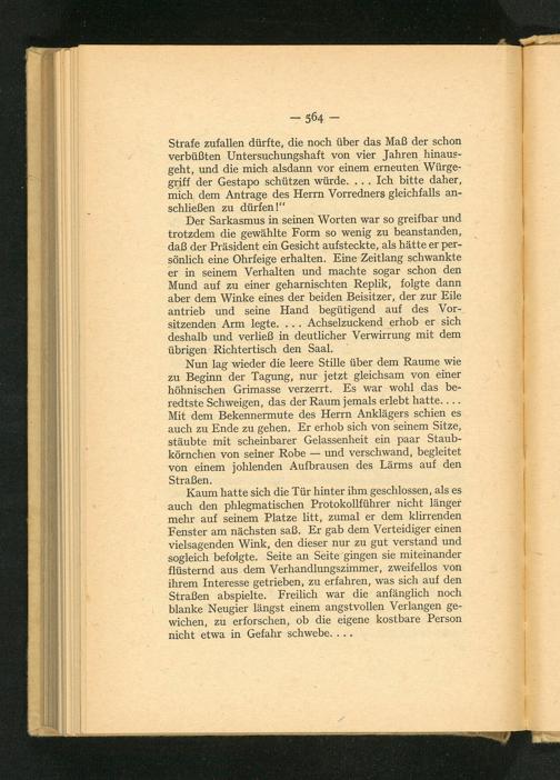 Nun lag wieder die leere Stille über dem Raume wie zu Beginn der Tagung, nur jetzt gleichsam von einer höhnischen Grimasse verzerrt. Es war wohl das beredtste Schweigen, das der Raum jemals erlebt hatte.... Mit dem Bekennermute des Herrn Anklägers schien es auch zu Ende zu gehen. Er erhob sich von seinem Sitze, stäubte mit scheinbarer Gelassenheit ein paar Staubkörnchen von seiner Robe- und verschwand, begleitet von einem johlenden Aufbrausen des Lärms auf den Straßen.