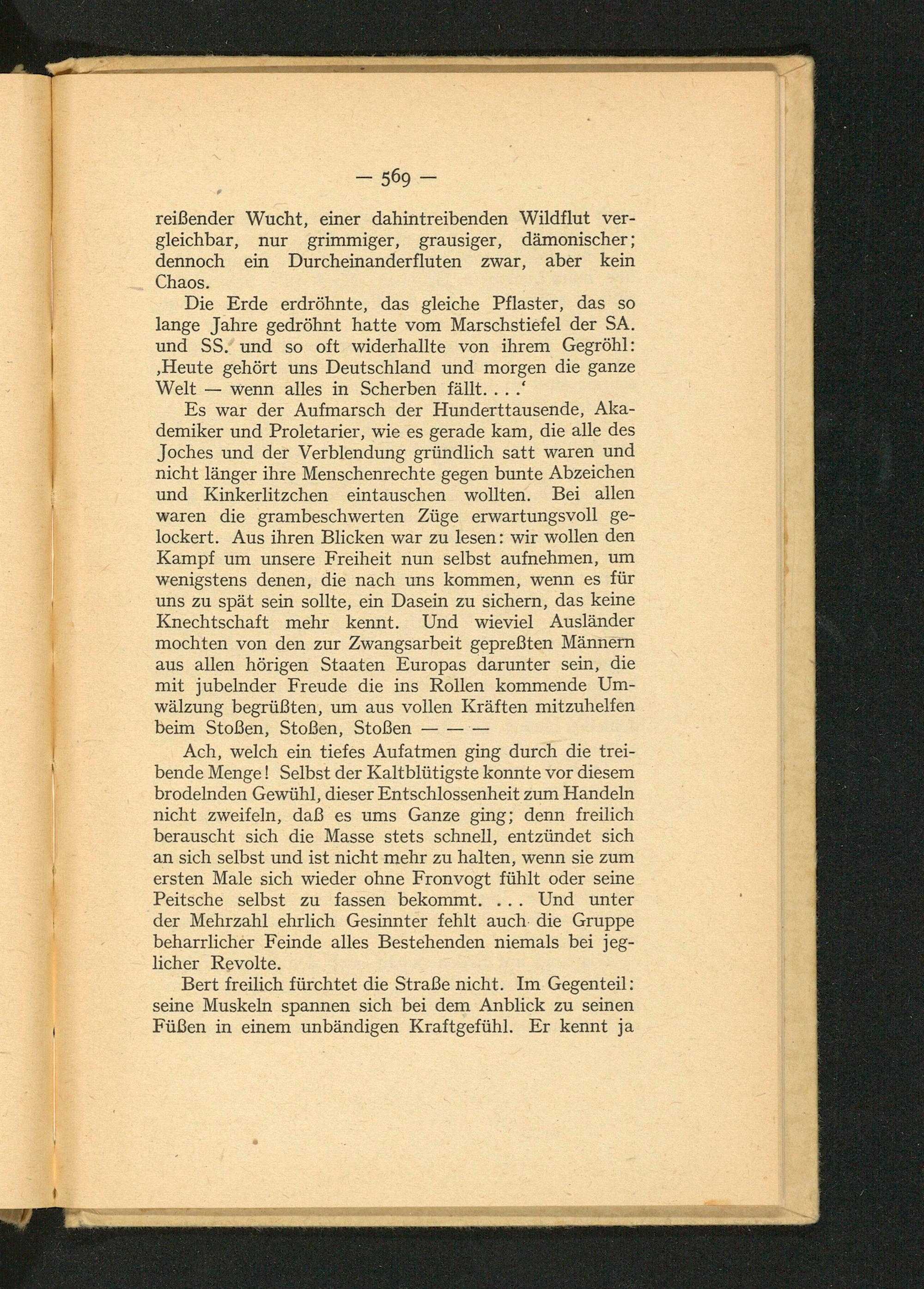 Es war der Aufmarsch der Hunderttausende, Akademiker und Proletarier, wie es gerade kam, die alle des Joches und der Verblendung gründlich satt waren und nicht länger ihre Menschenrechte gegen bunte Abzeichen und Kinkerlitzchen eintauschen wollten. Bei allen waren die grambeschwerten Züge erwartungsvoll gelockert. Aus ihren Blicken war zu lesen: wir wollen den Kampf um unsere Freiheit nun selbst aufnehmen, um wenigstens denen, die nach uns kommen, wenn es für uns zu spät sein sollte, ein Dasein zu sichern, das keine Knechtschaft mehr kennt. Und wieviel Ausländer mochten von den zur Zwangsarbeit gepreßten Männern aus allen hörigen Staaten Europas darunter sein, die mit jubelnder Freude die ins Rollen kommende Umwälzung begrüßten, um aus vollen Kräften mitzuhelfen. beim Stoßen, Stoßen, Stoßen-