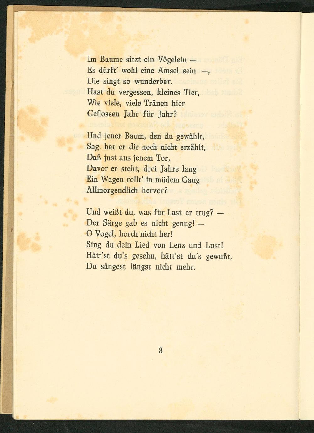 Sing du dein Lied von Lenz und Lust! Hätt'st du’s gesehn, hätt’st du’s gewußt, Du sängest längst nicht mehr.