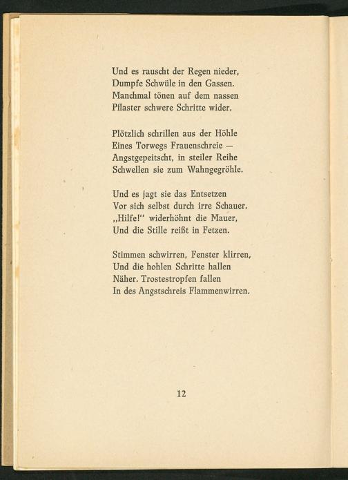 Plötzlich schrillen aus der Höhle Eines Torwegs Frauenschreie— Angstgepeitscht, in steiler Reihe Schwellen sie zum Wahngegröhle.