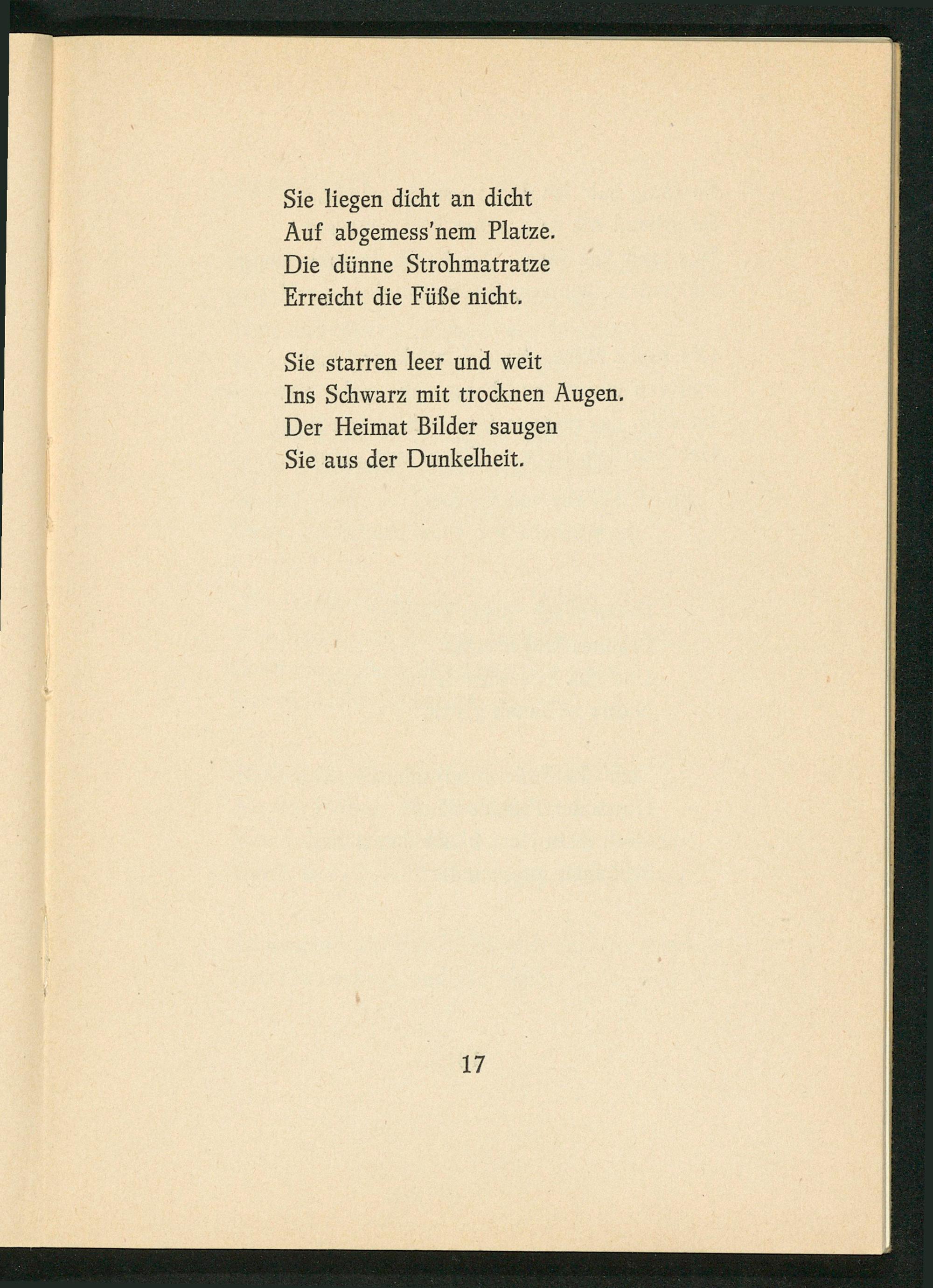 Sie starren leer und weit| Ins Schwarz mit trocknen Augen. Der Heimat Bilder saugen| Sie aus der Dunkelheit.
