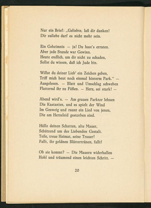 Hülle deinen Schatten, alte Mauer, Schützend um des Liebenden Gestalt. Teile, treue Heimat, seine Trauer! Fallt, ihr goldnen Blättertränen, fallt!