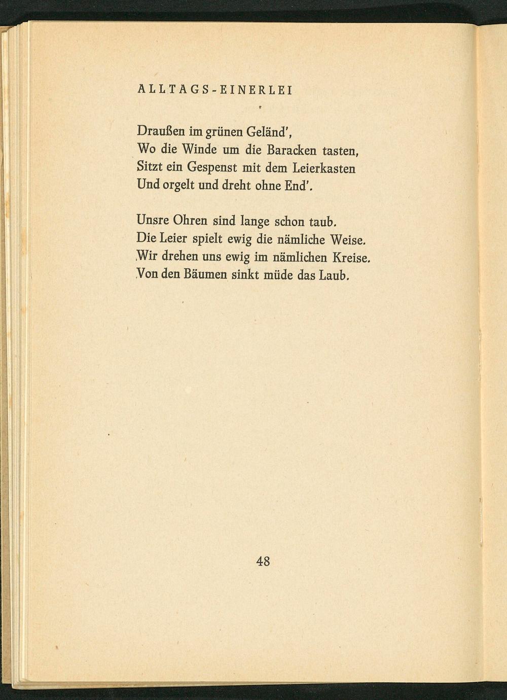 Wo die Winde um die Baracken tasten,| Sitzt ein Gespenst mit dem Leierkasten| Und orgelt und dreht ohne End’.