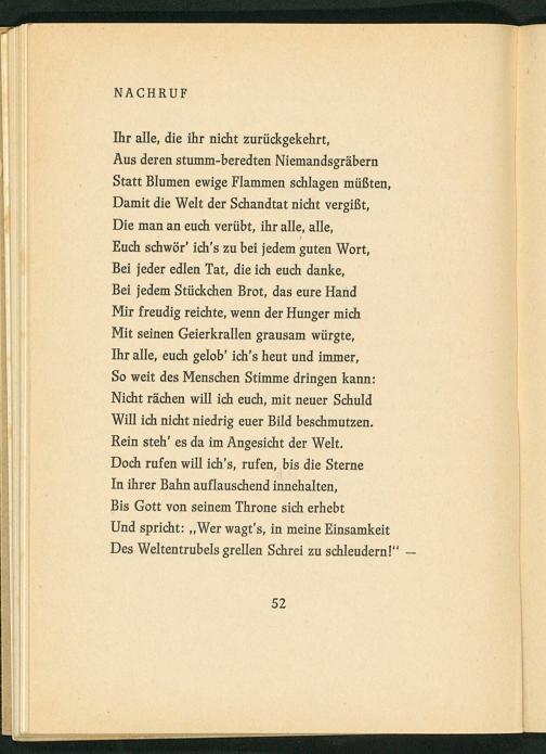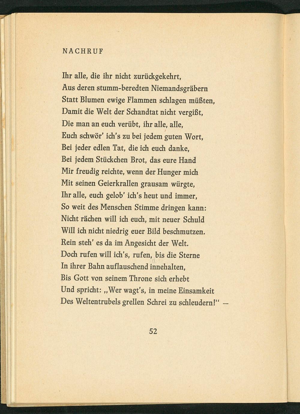 Ihr alle, die ihr nicht zurückgekehrt, Aus deren stumm- beredten Niemandsgräbern Statt Blumen ewige Flammen schlagen müßten, Damit die Welt der Schandtat nicht vergiẞt, Die man an euch verübt, ihr alle, alle, Euch schwör' ich's zu bei jedem guten Wort, Bei jeder edlen Tat, die ich euch danke, Bei jedem Stückchen Brot, das eure Hand Mir freudig reichte, wenn der Hunger mich Mit seinen Geierkrallen grausam würgte, Ihr alle, euch gelob' ich's heut und immer, So weit des Menschen Stimme dringen kann: Nicht rächen will ich euch, mit neuer Schuld Will ich nicht niedrig euer Bild beschmutzen. Rein steh' es da im Angesicht der Welt. Doch rufen will ich's, rufen, bis die Sterne In ihrer Bahn auflauschend innehalten,