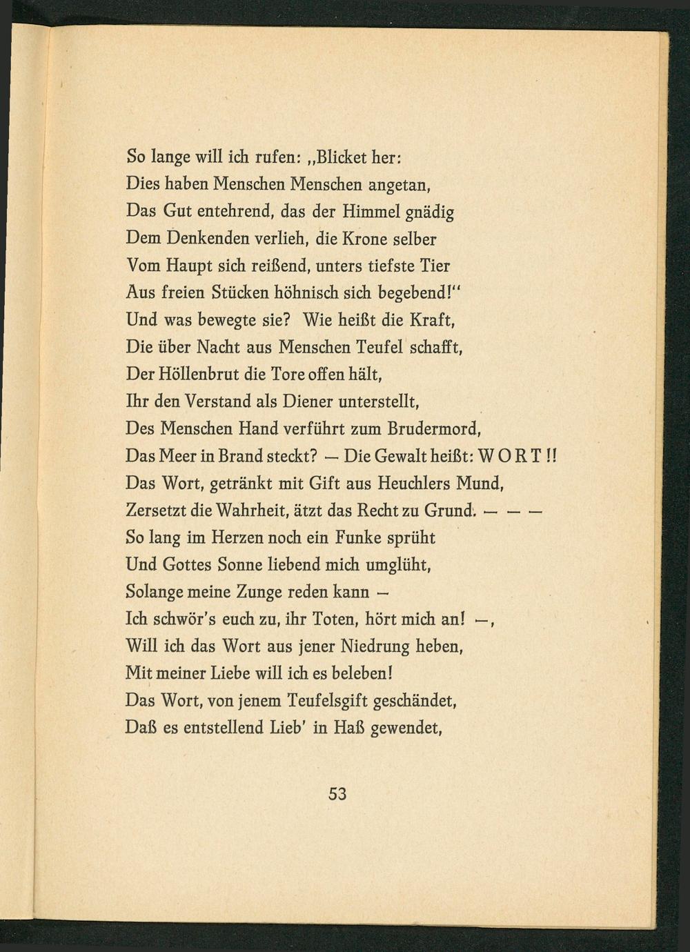 Des Menschen Hand verführt zum Brudermord, Das Meer in Brand steckt?— Die Gewalt heißt: WORT!!! Das Wort, getränkt mit Gift aus Heuchlers Mund, Zersetzt die Wahrheit, ätzt das Recht zu Grund.——— So lang im Herzen noch ein Funke sprüht