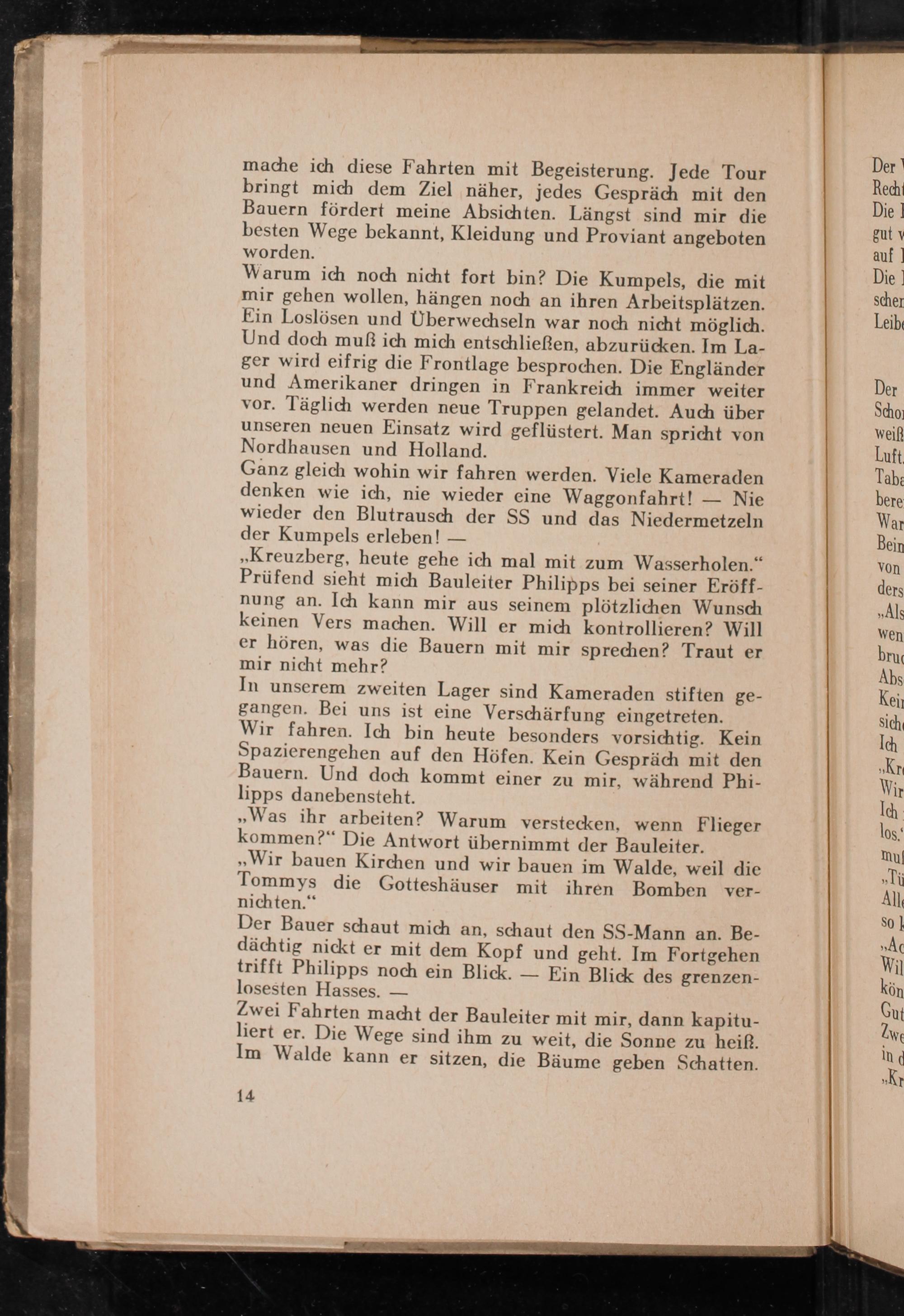 Warum ich noch nicht fort bin? Die Kumpels, die mit mir gehen wollen, hängen noch an ihren Arbeitsplätzen. Ein Loslösen und Überwechseln war noch nicht möglich. Und doch muß ich mich entschließen, abzurücken. Im Lager wird eifrig die Frontlage besprochen. Die Engländer und Amerikaner dringen in Frankreich immer weiter vor. Täglich werden neue Truppen gelandet. Auch über unseren neuen Einsatz wird geflüstert. Man spricht von Nordhausen und Holland .