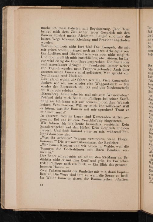 ,, Was ihr arbeiten? Warum verstecken, wenn Flieger kommen?" Die Antwort übernimmt der Bauleiter. ,, Wir bauen Kirchen und wir bauen im Walde, weil die Tommys die Gotteshäuser mit ihren Bomben vernichten."
