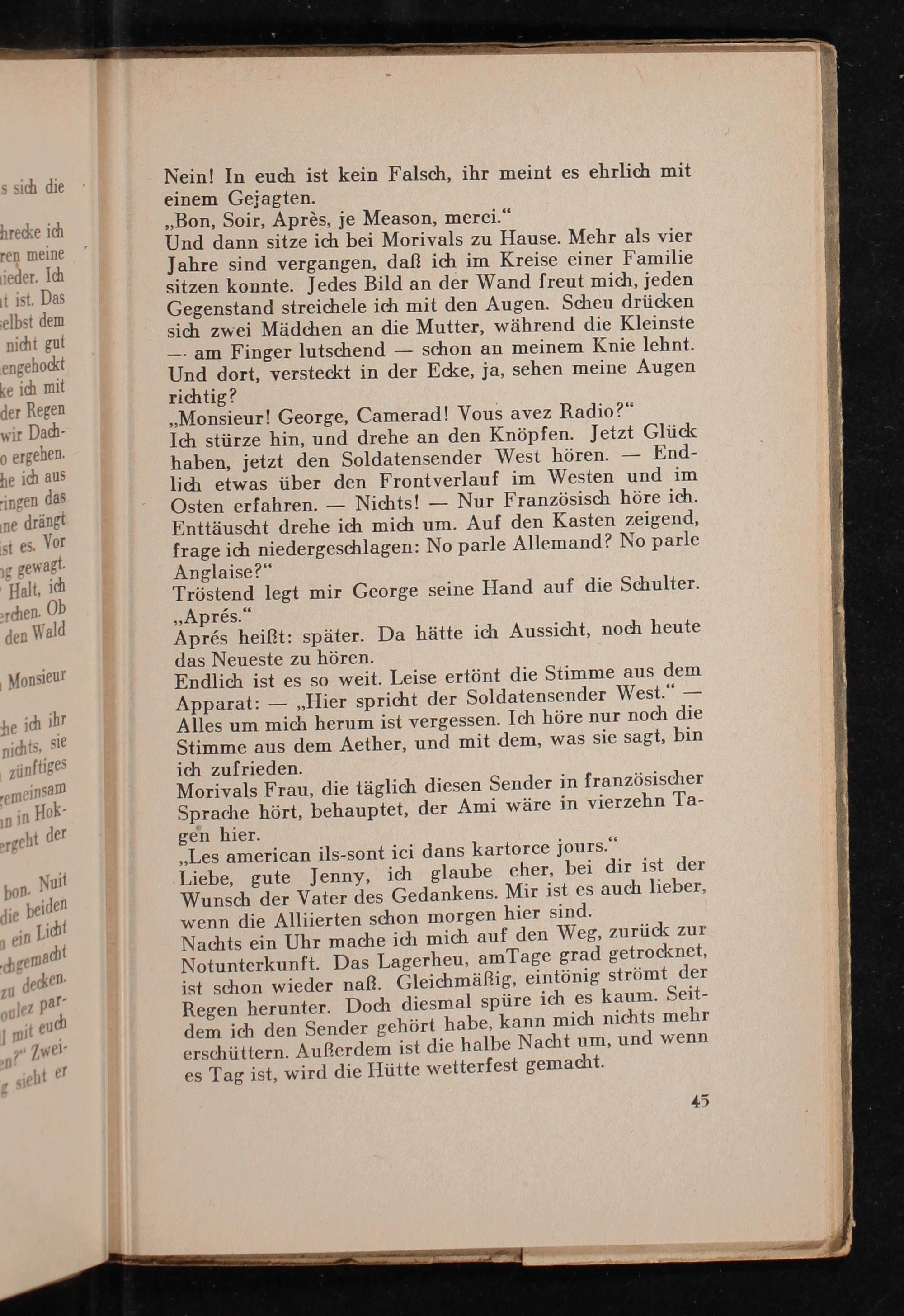 Ich stürze hin, und drehe an den Knöpfen. Jetzt Glück Endhaben, jetzt den Soldatensender West hören. lich etwas über den Front verlauf im Westen und im Nichts! Osten erfahren. Nur Französisch höre ich. Enttäuscht drehe ich mich um. Auf den Kasten zeigend, frage ich niedergeschlagen: No parle Allemand? No parle Anglaise?"