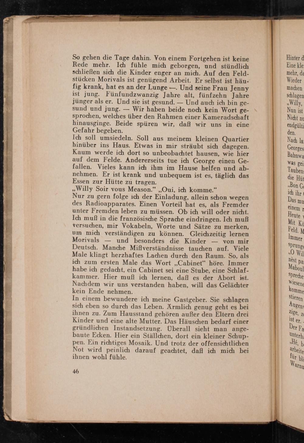 Nur zu gern folge ich der Einladung, allein schon wegen des Radioapparates. Einen Vorteil hat es, als Fremder unter Fremden leben zu müssen. Ob ich will oder nicht. Ich muß in die französische Sprache eindringen. Ich muß versuchen, mir Vokabeln, Worte und Sätze zu merken, um mich verständigen zu können. Gleichzeitig lernen Morivals und besonders die Kinder von mir Deutsch . Manche Mißverständnisse tauchen auf. Viele Male klingt herzhaftes Lachen durch den Raum. So, als ich zum ersten Male das Wort„, Cabinet" höre. Immer habe ich gedacht, ein Cabinet sei eine Stube, eine Schlafkammer. Hier muß ich lernen, daß es der Abort ist. Nachdem wir uns verstanden haben, will das Gelächter kein Ende nehmen.