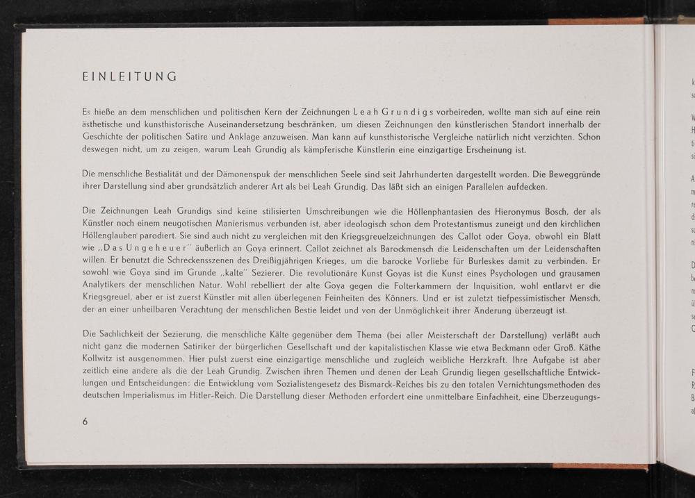 Es hieẞe an dem menschlichen und politischen Kern der Zeichnungen Leah Grundigs vorbeireden, wollte man sich auf eine rein ästhetische und kunsthistorische Auseinandersetzung beschränken, um diesen Zeichnungen den künstlerischen Standort innerhalb der Geschichte der politischen Satire und Anklage anzuweisen. Man kann auf kunsthistorische Vergleiche natürlich nicht verzichten. Schon deswegen nicht, um zu zeigen, warum Leah Grundig als kämpferische Künstlerin eine einzigartige Erscheinung ist.