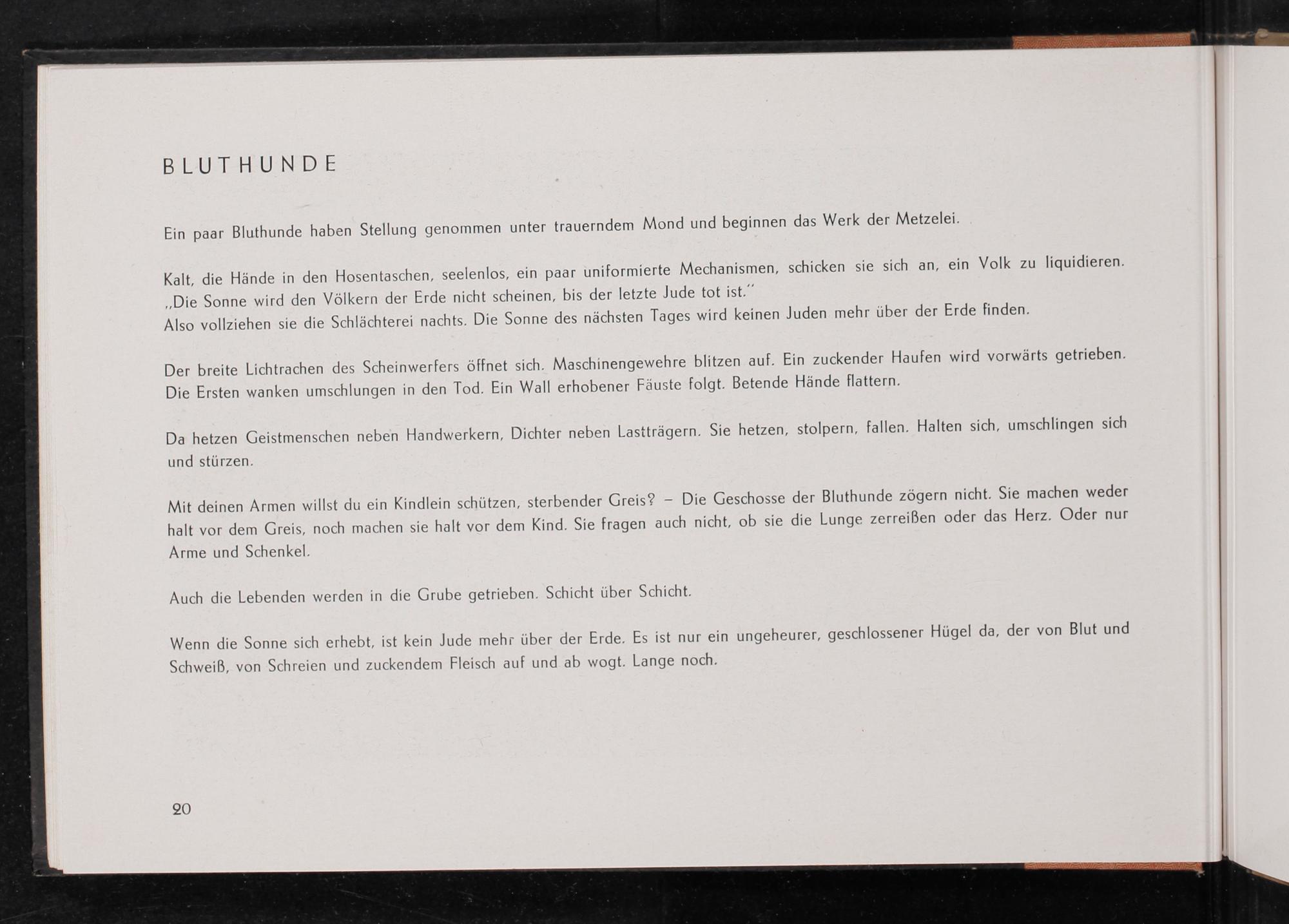 Wenn die Sonne sich erhebt, ist kein Jude mehr über der Erde. Es ist nur ein ungeheurer, geschlossener Hügel da, der von Blut und Schweiß, von Schreien und zuckendem Fleisch auf und ab wogt. Lange noch.