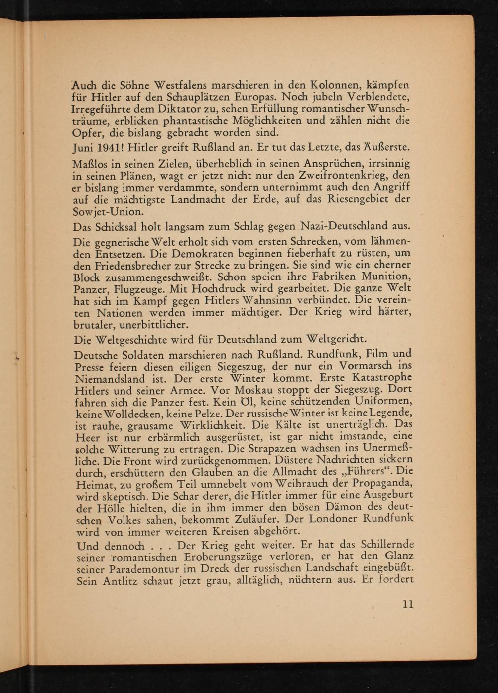 Auch die Söhne Westfalens marschieren in den Kolonnen, kämpfen für Hitler auf den Schauplätzen Europas . Noch jubeln Verblendete, Irregeführte dem Diktator zu, sehen Erfüllung romantischer Wunschträume, erblicken phantastische Möglichkeiten und zählen nicht die Opfer, die bislang gebracht worden sind.