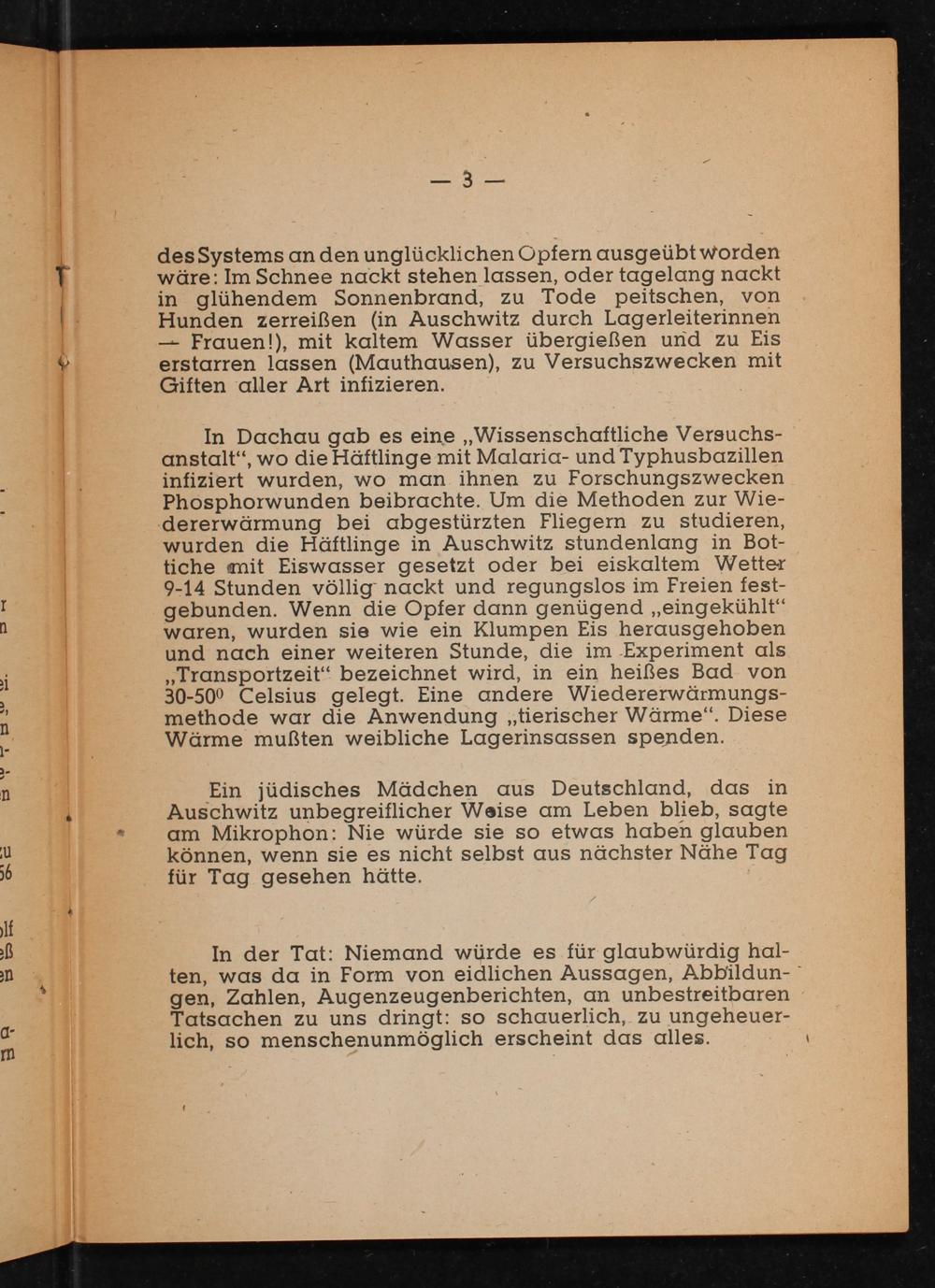 desSystems an den unglücklichen Opfern ausgeübt worden wäre: Im Schnee nackt stehen lassen, oder tagelang nackt in glühendem Sonnenbrand, zu Tode peitschen, von Hunden zerreißen(in Auschwitz durch Lagerleiterinnen — Frauen!), mit kaltem Wasser übergießen und zu Eis erstarren lassen(Mauthausen ), zu Versuchszwecken mit Giften aller Art infizieren.