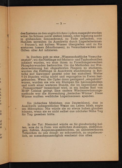 In Dachau gab es eine„Wissenschaftliche Versuchs- anstalt“, wo die Häftlinge mit Malaria- und Typhusbazillen infiziert wurden, wo man ihnen zu Forschungszwecken Phosphorwunden beibrachte. Um die Methoden zur Wie- .dererwärmung bei abgestürzten Fliegern zu studieren, wurden die Häftlinge in Auschwitz stundenlang in Bot- tiche mit Eiswasser gesetzt oder bei eiskaltem Wetter 9-14 Stunden völlig nackt und regungslos im Freien fest- gebunden. Wenn die Opfer dann genügend„eingekühlt“ waren, wurden sie wie ein Klumpen Eis herausgehoben und nach einer weiteren Stunde, die im Experiment als „Transportzeit“ bezeichnet wird, in ein heißes Bad von 30-500 Celsius gelegt. Eine andere Wiedererwärmungs- methode war die Anwendung„tierischer Wärme“. Diese Wärme mußten weibliche Lagerinsassen spenden.
