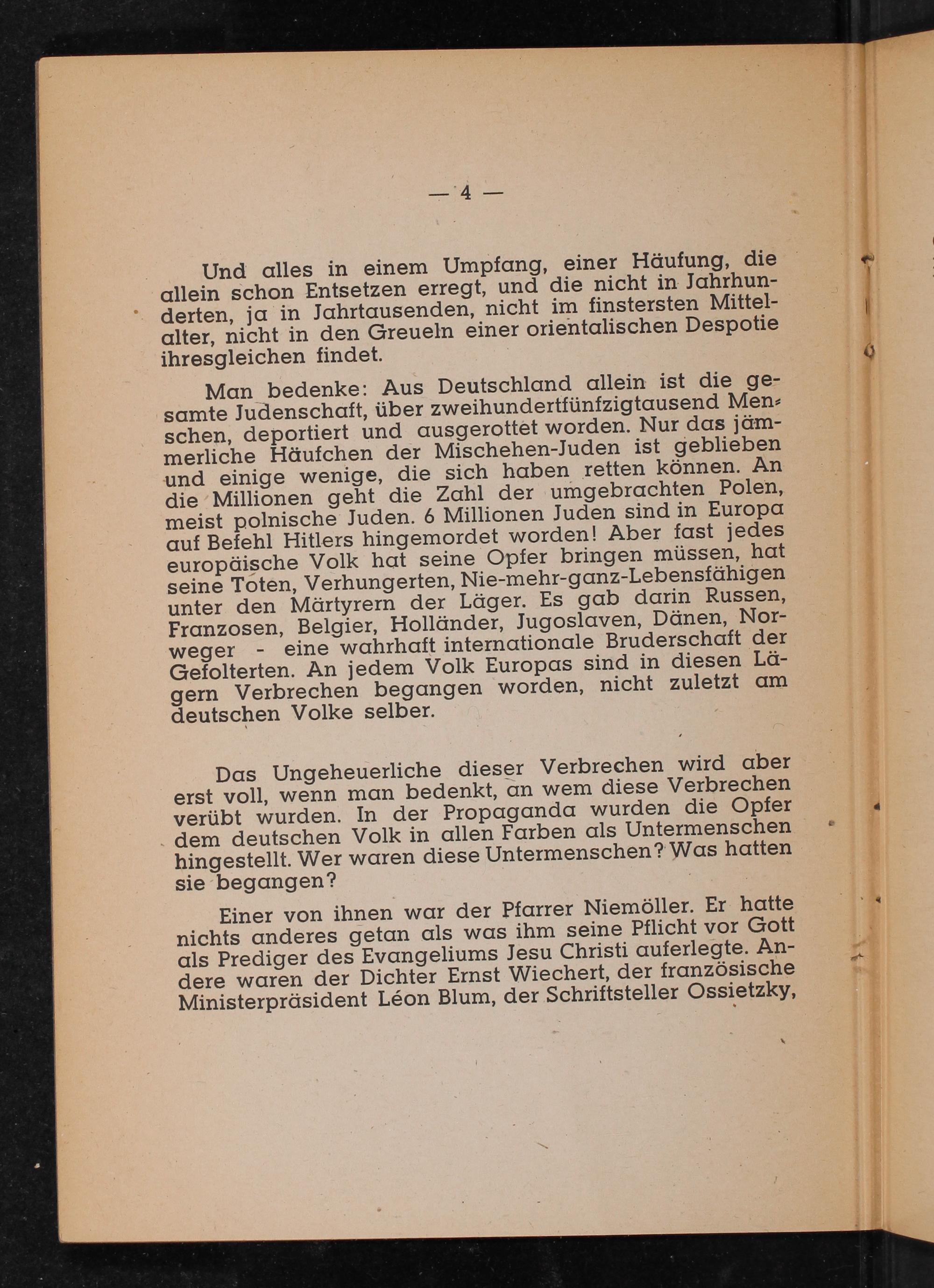 Man bedenke: Aus Deutschland allein ist die gesamte Judenschaft, über zweihundertfünfzigtausend Menschen, deportiert und ausgerottet worden. Nur das jämmerliche Häufchen der Mischehen- Juden ist geblieben und einige wenige, die sich haben retten können. An die Millionen geht die Zahl der umgebrachten Polen , meist polnische Juden. 6 Millionen Juden sind in Europa auf Befehl Hitlers hingemordet worden! Aber fast jedes europäische Volk hat seine Opfer bringen müssen, hat seine Toten, Verhungerten, Nie- mehr- ganz- Lebensfähigen unter den Märtyrern der Läger. Es gab darin Russen, Franzosen, Belgier, Holländer, Jugoslaven, Dänen, Norweger eine wahrhaft internationale Bruderschaft der Gefolterten. An jedem Volk Europas sind in diesen Lägern Verbrechen begangen worden, nicht zuletzt am deutschen Volke selber.