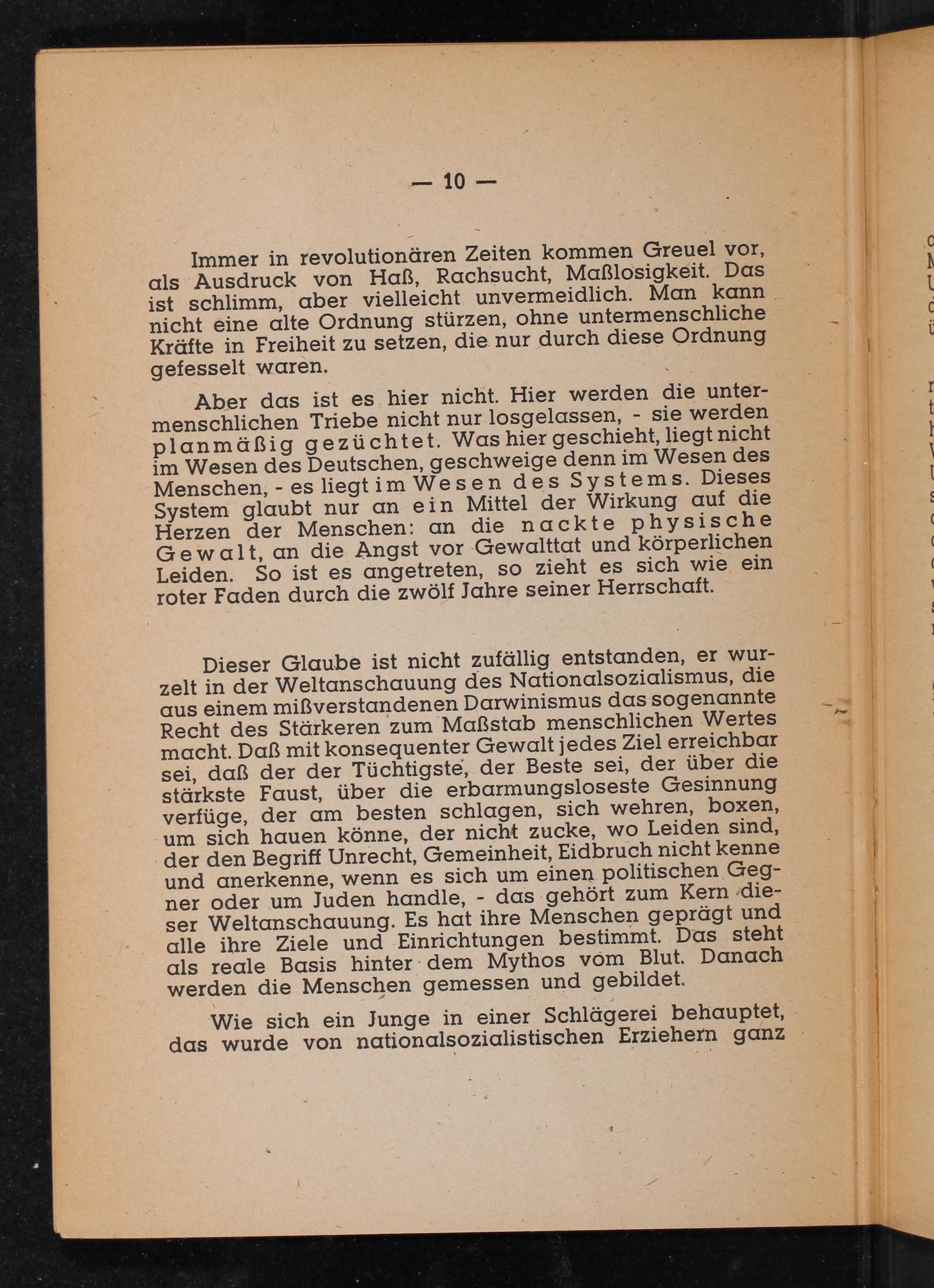 Dieser Glaube ist nicht zufällig entstanden, er wurzelt in der Weltanschauung des Nationalsozialismus, die aus einem mißverstandenen Darwinismus das sogenannte Recht des Stärkeren zum Maßstab menschlichen Wertes macht. Daß mit konsequenter Gewalt jedes Ziel erreichbar sei, daß der der Tüchtigste, der Beste sei, der über die stärkste Faust, über die erbarmungsloseste Gesinnung verfüge, der am besten schlagen, sich wehren, boxen, um sich hauen könne, der nicht zucke, wo Leiden sind, der den Begriff Unrecht, Gemeinheit, Eidbruch nicht kenne und anerkenne, wenn es sich um einen politischen Gegner oder um Juden handle,- das gehört zum Kern dieser Weltanschauung. Es hat ihre Menschen geprägt und alle ihre Ziele und Einrichtungen bestimmt. Das steht als reale Basis hinter dem Mythos vom Blut. Danach werden die Menschen gemessen und gebildet.
