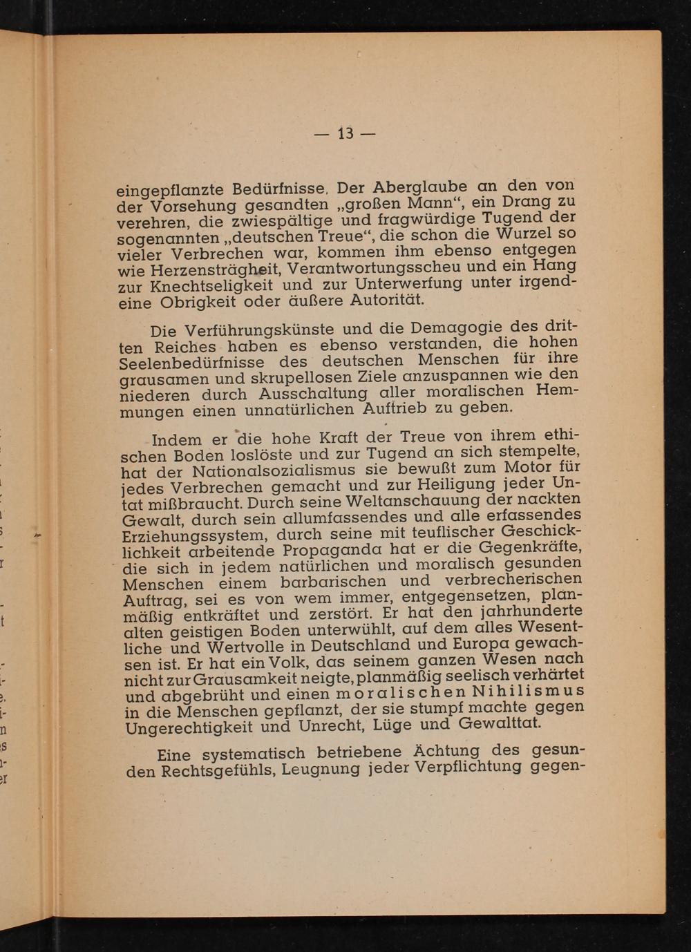 Indem er die hohe Kraft der Treue von ihrem ethischen Boden loslöste und zur Tugend an sich stempelte, hat der Nationalsozialismus sie bewußt zum Motor für jedes Verbrechen gemacht und zur Heiligung jeder Untat miẞbraucht. Durch seine Weltanschauung der nackten Gewalt, durch sein allumfassendes und alle erfassendes Erziehungssystem, durch seine mit teuflischer Geschicklichkeit arbeitende Propaganda hat er die Gegenkräfte, die sich in jedem natürlichen und moralisch gesunden Menschen einem barbarischen und verbrecherischen Auftrag, sei es von wem immer, entgegensetzen, planmäßig entkräftet und zerstört. Er hat den jahrhunderte alten geistigen Boden unterwühlt, auf dem alles Wesentliche und Wertvolle in Deutschland und Europa gewachsen ist. Er hat ein Volk, das seinem ganzen Wesen nach nicht zur Grausamkeit neigte, planmäßig seelisch verhärtet und abgebrüht und einen moralischen Nihilismus in die Menschen gepflanzt, der sie stumpf machte gegen Ungerechtigkeit und Unrecht, Lüge und Gewalttat.
