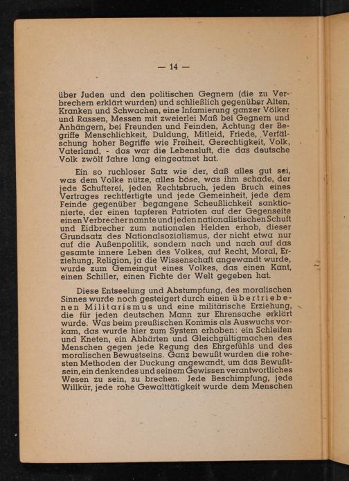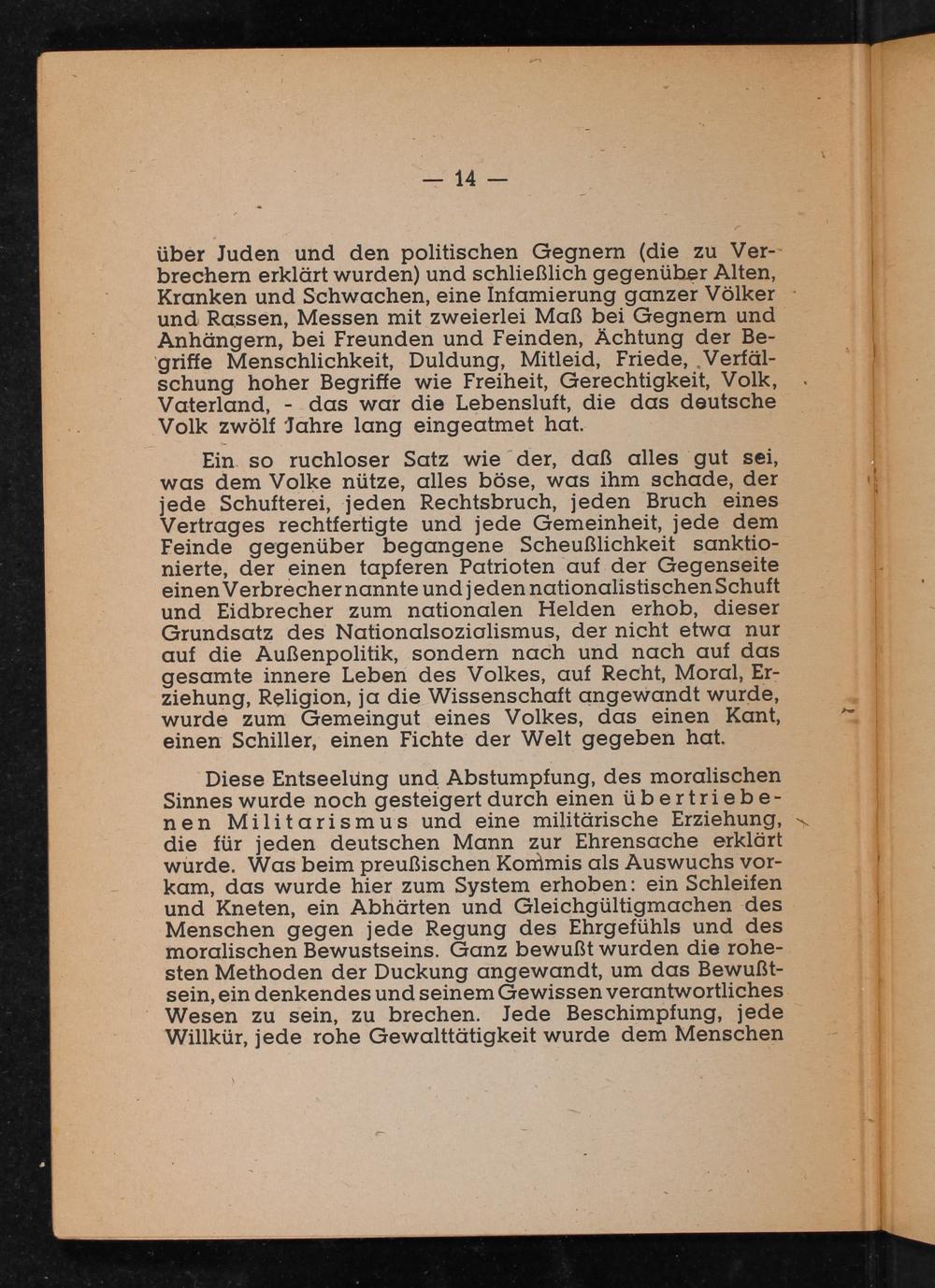Ein so ruchloser Satz wie der, daß alles gut sei, was dem Volke nütze, alles böse, was ihm schade, der jede Schufterei, jeden Rechtsbruch, jeden Bruch eines Vertrages rechtfertigte und jede Gemeinheit, jede dem Feinde gegenüber begangene Scheußlichkeit sanktionierte, der einen tapferen Patrioten auf der Gegenseite einen Verbrecher nannte und jeden nationalistischen Schuft und Eidbrecher zum nationalen Helden erhob, dieser Grundsatz des Nationalsozialismus, der nicht etwa nur auf die Außenpolitik, sondern nach und nach auf das gesamte innere Leben des Volkes, auf Recht, Moral, Erziehung, Religion, ja die Wissenschaft angewandt wurde, wurde zum Gemeingut eines Volkes, das einen Kant, einen Schiller, einen Fichte der Welt gegeben hat.